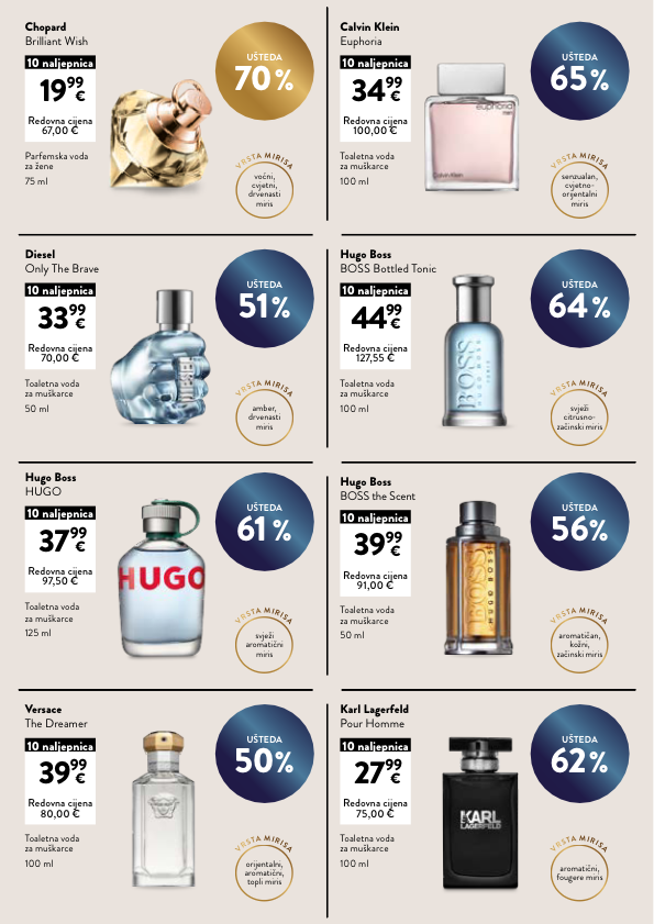 UŠTEDA 51 % UŠTEDA 50 % UŠTEDA 64 % UŠTEDA 62 % UŠTEDA 70 % UŠTEDA 61 % UŠTEDA 65 % UŠTEDA 56 % V R S T A M I R I S A voćni, cvjetni, drvenasti miris Parfemska voda za žene 75 ml Chopard Brilliant Wish 19 99 10 naljepnica Redovna cijena 67,00 € € V R S T A M I R I S A senzualan, cvjetno- orijentalni miris Toaletna voda za muškarce 100 ml Calvin Klein Euphoria 34 99 10 naljepnica Redovna cijena 100,00 € € V R S T A M I R I S A amber, drvenasti miris Toaletna voda za muškarce 50 ml Diesel Only The Brave 33 99 10 naljepnica Redovna cijena 70,00 € € V R S T A M I R I S A svježi citrusno- začinski miris Toaletna voda za muškarce 100 ml Hugo Boss BOSS Bottled Tonic 44 99 10 naljepnica Redovna cijena 127,55 € € V R S T A M I R I S A aromatičan, kožni, začinski miris Toaletna voda za muškarce 50 ml Hugo Boss BOSS the Scent 39 99 10 naljepnica Redovna cijena 91,00 € € V R S T A M I R I S A orijentalni, aromatični, topli miris Toaletna voda za muškarce 100 ml Versace The Dreamer 39 99 10 naljepnica Redovna cijena 80,00 € € V R S T A M I R I S A aromatični, fougere miris Toaletna voda za muškarce 100 ml Karl Lagerfeld Pour Homme 27 99 10 naljepnica Redovna cijena 75,00 € € V R S T A M I R I S A svježi aromatični miris Hugo Boss HUGO 37 99 10 naljepnica Redovna cijena 97,50 € € Toaletna voda za muškarce 125 ml