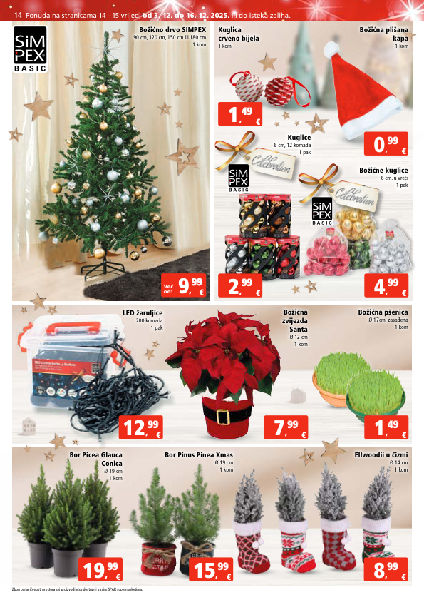 € 1 , 49 49 € 2 , 99 99 € 12 , 99 99 € 19 , 99 99 € 15 , 99 99 € 8 , 99 99 € 4 , 99 99 € 1 , 4 49 9 € 7 , 99 99 € 0 , 99 99 Već od: € 9 , 99 99 Božićno drvo SIMPEX 90 cm, 120 cm, 150 cm ili 180 cm 1 kom LED žaruljice 200 komada 1 pak Bor Picea Glauca Conica Ø 19 cm 1 kom Bor Pinus Pinea Xmas Ø 19 cm 1 kom Ellwoodii u čizmi Ø 14 cm 1 kom Božićna plišana kapa 1 kom Božićne kuglice 6 cm, u vreći 1 pak Božićna pšenica Ø 17cm, zasađena 1 kom Božićna zvijezda Santa Ø 12 cm 1 kom Kuglice 6 cm, 12 komada 1 pak Kuglica crveno bijela 1 kom Zbog ograničenosti prostora svi proizvodi nisu dostupni u svim SPAR supermarketima. 14 Ponuda na stranicama 14 - 15 vrijedi od 3. 12. do 16. 12. 2025. ili do isteka zaliha.