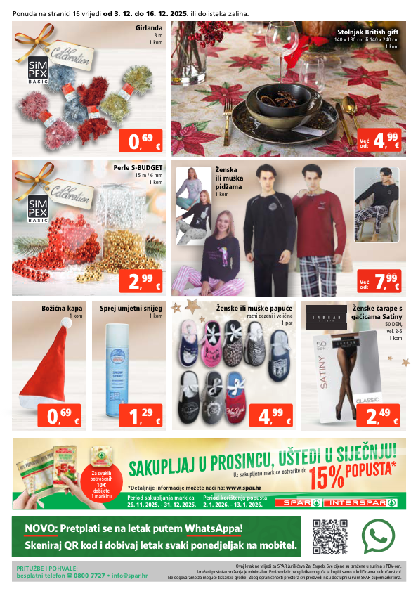 *detaljnije informacije možete naći na: www.spar.hr period sakupljanja markica: 26. 11. 2025. - 31. 12. 2025. period korištenja popusta: 2. 1. 2026. - 13. 1. 2026. za svakih potrošenih 10 € dobijete 1 markicu sakupljaj u prosincu, uštedi u siječnju! 15% popusta* uz sakupljene markice ostvarite do novo: pretplati se na letak putem whatsappa! skeniraj qr kod i dobivaj letak svake srijede na mobitel. novo: pretplati se na letak putem whatsappa! skeniraj qr kod i dobivaj letak svaki ponedjeljak na mobitel. perle s-budget 15 m / 6 mm 1 kom girlanda 3 m 1 kom sprej umjetni snijeg 1 kom božićna kapa 1 kom € 0 , 69 69 € 1 , 29 29 € 4 , 9 99 9 € 2 , 4 49 9 € 0 , 69 69 € 2 , 99 99 ženske čarape s gaćicama satiny 50 den, vel. 2-5 1 kom ženske ili muške papuče razni dezeni i veličine 1 par ženska ili muška pidžama 1 kom stolnjak british gift 140 x 180 cm ili 140 x 240 cm 1 kom već od: € 4 , 99 99 već od: € 7 , 99 99 prituæbe i pohvale: besplatni telefon 0800 7727 • info@spar.hr ponuda na stranici 16 vrijedi od 3. 12. do 16. 12. 2025. ili do isteka zaliha. ovaj letak ne vrijedi za spar jurišićeva 2a, zagreb. sve cijene su izražene u eurima s pdv-om. izraženi postotak sniženja je minimalan. proizvode iz ovog letka moguće je kupiti samo u količinama za kućanstvo! ne odgovaramo za moguće tiskarske greške! zbog ograničenosti prostora svi proizvodi nisu dostupni u svim spar supermarketima.