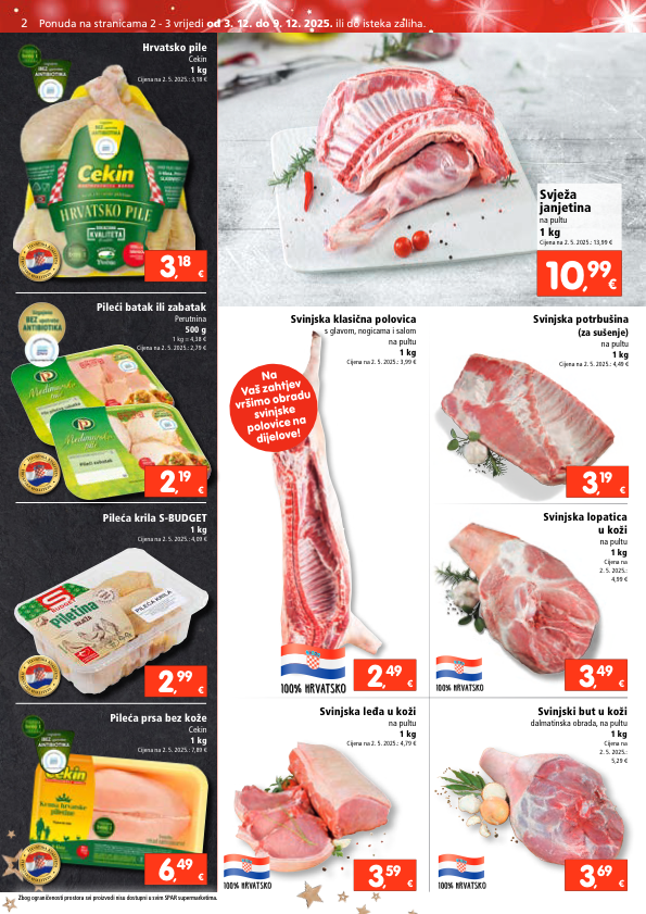 svježa janjetina na pultu 1 kg cijena na 2. 5. 2025.: 13,99 € 10 , 99 € hrvatsko pile cekin 1 kg cijena na 2. 5. 2025.: 3,18 € pileći batak ili zabatak perutnina 500 g 1 kg = 4,38 € cijena na 2. 5. 2025.: 2,79 € € 3 , 18 € 2 , 19 pileća krila s-budget 1 kg cijena na 2. 5. 2025.: 4,09 € pileća prsa bez kože cekin 1 kg cijena na 2. 5. 2025.: 7,89 € € 2 , 99 € 6 , 49 svinjska potrbušina (za sušenje) na pultu 1 kg cijena na 2. 5. 2025.: 4,49 € svinjska klasična polovica s glavom, nogicama i salom na pultu 1 kg cijena na 2. 5. 2025.: 3,99 € svinjska leđa u koži na pultu 1 kg cijena na 2. 5. 2025.: 4,79 € svinjska lopatica u koži na pultu 1 kg cijena na 2. 5. 2025.: 4,99 € svinjski but u koži dalmatinska obrada, na pultu 1 kg cijena na 2. 5. 2025.: 5,29 € € 3 , 19 € 2 , 49 € 3 , 59 € 3 , 49 € 3 , 69 h r v a t s k a k v a l i t e t a h r v a t s k a k v a l i t e t a h r v a t s k a k v a l i t e t a h r v a t s k a k v a l i t e t a h r v a t s k a k v a l i t e t a h r v a t s k a k v a l i t e t a h r v a t s k a k v a l i t e t a h r v a t s k a k v a l i t e t a 100% hrvatsko na vaš zahtjev vršimo obradu svinjske polovice na dijelove! 100% hrvatsko 100% hrvatsko 100% hrvatsko zbog ograničenosti prostora svi proizvodi nisu dostupni u svim spar supermarketima. 2 ponuda na stranicama 2 - 3 vrijedi od 3. 12. do 9. 12. 2025. ili do isteka zaliha. zbog ograničenosti prostora svi proizvodi nisu dostupni u svim spar supermarketima.