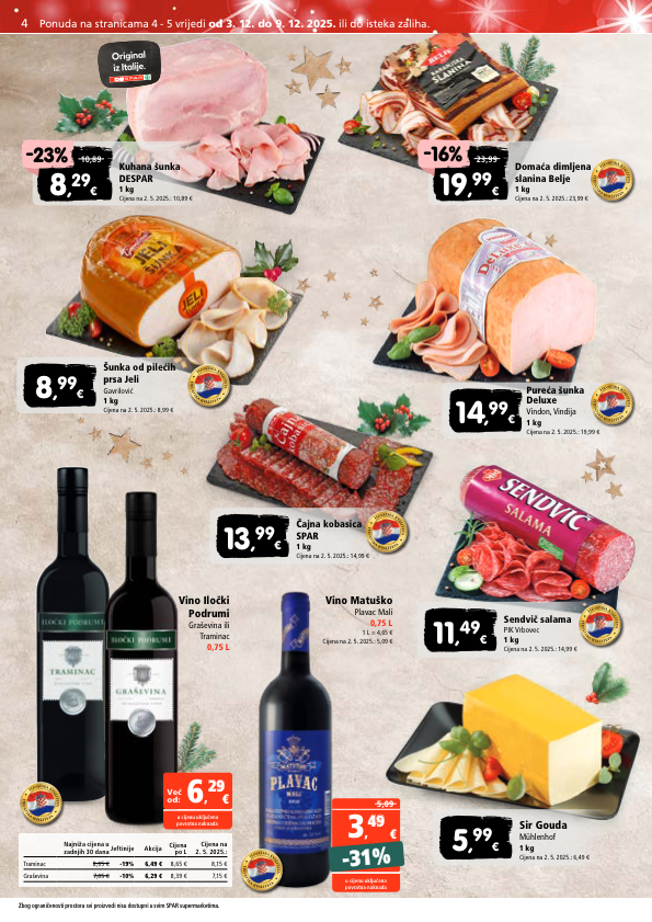 original iz italije. najniža cijena u zadnjih 30 dana jeftinije akcija cijena po l cijena na 2. 5. 2025.: traminac 8,05 € -19% 6,49 € 8,65 € 8,15 € graševina 7,05 € -10% 6,29 € 8,39 € 7,15 € 13 , 99 € čajna kobasica spar 1 kg cijena na 2. 5. 2025.: 14,99 € 5 , 99 € sir gouda mühlenhof 1 kg cijena na 2. 5. 2025.: 6,49 € kuhana šunka despar 1 kg cijena na 2. 5. 2025.: 10,89 € 10,89 8 , 29 € -23% domaća dimljena slanina belje 1 kg cijena na 2. 5. 2025.: 23,99 € 23,99 19 , 99 € -16% već od: € 6 , 29 29 u cijenu uključena povratna naknada -31% -31% 5,09 € 3 , 49 49 u cijenu uključena povratna naknada vino matuško plavac mali 0,75 l 1 l = 4,65 € cijena na 2. 5. 2025.: 5,09 € vino iločki podrumi graševina ili traminac 0,75 l h r v a t s k a k v a l i t e t a h r v a t s k a k v a l i t e t a 14 , 99 € pureća šunka deluxe vindon, vindija 1 kg cijena na 2. 5. 2025.: 19,99 € h r v a t s k a k v a l i t e t a h r v a t s k a k v a l i t e t a h r v a t s k a k v a l i t e t a h r v a t s k a k v a l i t e t a h r v a t s k a k v a l i t e t a h r v a t s k a k v a l i t e t a 8 , 99 € šunka od pilećih prsa jeli gavrilović 1 kg cijena na 2. 5. 2025.: 8,99 € h r v a t s k a k v a l i t e t a h r v a t s k a k v a l i t e t a h r v a t s k a k v a l i t e t a h r v a t s k a k v a l i t e t a 11 , 49 € sendvič salama pik vrbovec 1 kg cijena na 2. 5. 2025.: 14,99 € h r v a t s k a k v a l i t e t a h r v a t s k a k v a l i t e t a zbog ograničenosti prostora svi proizvodi nisu dostupni u svim spar supermarketima. 4 ponuda na stranicama 4 - 5 vrijedi od 3. 12. do 9. 12. 2025. ili do isteka zaliha. zbog ograničenosti prostora svi proizvodi nisu dostupni u svim spar supermarketima.