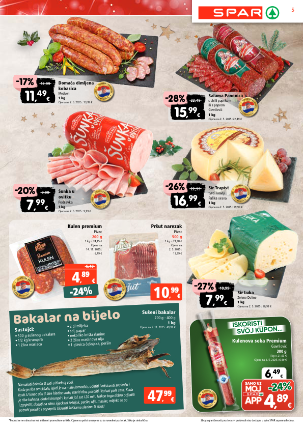 h r v a t s k a k v a l i t e t a h r v a t s k a k v a l i t e t a h r v a t s k a k v a l i t e t a h r v a t s k a k v a l i t e t a € 47 , 99 99 € 10 , 99 99 -24% -24% 6,49 € 4 , 89 89 sir luka zelene doline 1 kg cijena na 2. 5. 2025.: 10,99 € 10,99 7 , 99 € -27% domaća dimljena kobasica medven 1 kg cijena na 2. 5. 2025.: 13,99 € 13,99 11 , 49 € -17% h r v a t s k a k v a l i t e t a h r v a t s k a k v a l i t e t a šunka u ovitku podravka 1 kg cijena na 2. 5. 2025.: 9,99 € 9,99 7 , 99 € -20% h r v a t s k a k v a l i t e t a h r v a t s k a k v a l i t e t a salama panonica s chilli paprikom ili s paprom gavrilović 1 kg cijena na 2. 5. 2025.:22,49 € 22,49 15 , 99 € -28% h r v a t s k a k v a l i t e t a h r v a t s k a k v a l i t e t a sir trapist tvrdi kravlji paška sirana 1 kg cijena na 2. 5. 2025.: 19,99 € 22,99 16 , 99 € -26% h r v a t s k a k v a l i t e t a h r v a t s k a k v a l i t e t a 6 , 49 € iskoristi svoj kupon... samo uz 4 , 89 € -24% -24% sušeni bakalar 200 g - 400 g 1 kg cijena na 5. 11. 2025.: 49,99 € kulenova seka premium gavrilović 300 g 1 kg = 21,63 € cijena na 2. 5. 2025.: 6,49 € h r v a t s k a k v a l i t e t a h r v a t s k a k v a l i t e t a pršut narezak pivac 500 g 1 kg = 21,98 € cijena na 2. 5. 2025.: 13,99 € kulen premium pivac 200 g 1 kg = 24,45 € cijena na 14. 11. 2025.: 6,49 € bakalar na bijelo sastojci: • 500 g sušenog bakalara • 1/2 kg krumpira • 1 žlica maslaca • 2 dl mlijeka • sol, papar • nekoliko kriški slanine • 2 žlice maslinova ulja • 1 glavica češnjaka, peršin namakati bakalar 8 sati u hladnoj vodi. kada je riba omekšala, isjeći je na male komadiće, očistiti i odstraniti svu kožu i kosti. u lonac uliti 3 litre hladne vode, staviti ribu, posoliti i kuhati pola sata. kada je riba kuhana, dodati krumpir i kuhati još sat i 20 min. nakon toga dobro ocijediti i zgnječiti, dodati na sitno isjeckani češnjak, peršin, ulje, maslac, mlijeko te po potrebi posoliti i popapriti. ukrasiti kriškama slanine. u slast! 5 zbog ograničenosti prostora svi proizvodi nisu dostupni u svim spar supermarketima. *popust se ne odnosi na već snižene i promotivne artikle. cijene na polici umanjene su za navedeni postotak. slika je simbolična.