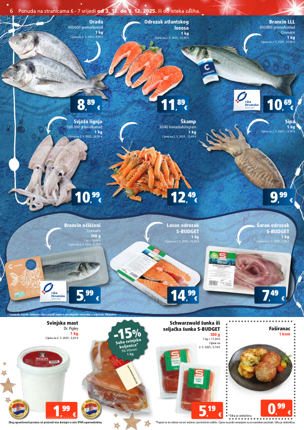 *ponuda svježe rinfuzne ribe vrijedi samo u prodajnim centrima s odjelom ribarnice € 8 , 89 89 € 11 , 89 89 € 10 , 69 69 € 9 , 99 99 € 12 , 49 49 € 10 , 99 99 € 5 , 99 99 € 14 , 99 99 € 7 , 49 49 škamp 30/40 komada/kilogram 1 kg cijena na 2. 5. 2025.: 13,49 € svježa lignja 100-300 grama/komad 1 kg cijena na 2. 5. 2025.: 29,99 € orada 400/600 grama/komad 1 kg cijena na 2. 5. 2025.: 9,99 € sipa 1 kg cijena na 2. 5. 2025.: 12,99 € brancin lll 600/800 grama/komad cromaris 1 kg cijena na 2. 5. 2025.: 10,99 € odrezak atlantskog lososa 1 kg cijena na 2. 5. 2025.: 12,99 € svinjska mast dr. pigley 1 kg cijena na 2. 5. 2025.: 2,20 € € 1 , 99 99 € 5 , 19 19 € 0 , 99 99 faširanac 1 kom h r v a t s k a k v a l i t e t a h r v a t s k a k v a l i t e t a h r v a t s k a k v a l i t e t a h r v a t s k a k v a l i t e t a *slika je simbolična. schwarzwald šunka ili seljačka šunka s-budget 300 g 1 kg = 17,30 € cijena na 2. 5. 2025.: 5,19 € brancin očišćeni cromaris 360 g 1 kg = 16,64 € cijena na 2. 5. 2025.: 6,29 € losos odrezak s-budget 1 kg cijena na 2. 5. 2025.: 16,29 € šaran odrezak s-budget 1 kg cijena na 2. 5. 2025.: 7,99 € zbog ograničenosti prostora svi proizvodi nisu dostupni u svim spar supermarketima. 6 ponuda na stranicama 6 - 7 vrijedi od 3. 12. do 9. 12. 2025. ili do isteka zaliha. zbog ograničenosti prostora svi proizvodi nisu dostupni u svim spar supermarketima. - 15 % suha svinjska koljenica* pik vrbovec 1 kg *popust se ne odnosi na već snižene i promotivne artikle. cijene na polici umanjene su za navedeni postotak. slika je simbolična.