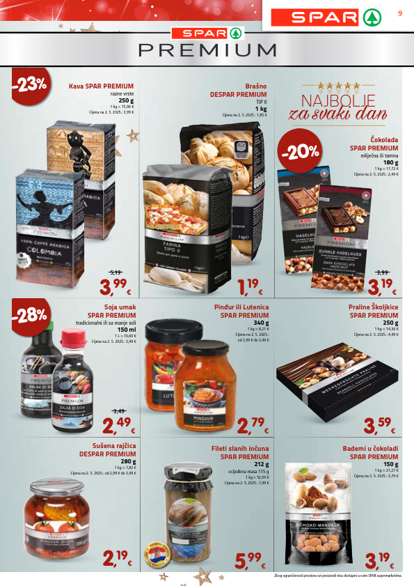kava spar premium razne vrste 250 g 1 kg = 15,96 € cijena na 2. 5. 2025.: 3,99 € sušena rajčica despar premium 280 g 1 kg = 7,82 € cijena na 2. 5. 2025.: od 2,99 € do 3,49 € soja umak spar premium tradicionalni ili sa manje soli 150 ml 1 l = 16,60 € cijena na 2. 5. 2025.: 3,49 € pinđur ili lutenica spar premium 340 g 1 kg = 8,21 € cijena na 2. 5. 2025.: od 2,99 € do 3,49 € fileti slanih inćuna spar premium 212 g ocijeđena masa 115 g 1 kg = 52,09 € cijena na 2. 5. 2025.: 7,49 € praline školjkice spar premium 250 g 1 kg = 14,36 € cijena na 2. 5. 2025.: 4,49 € bademi u čokoladi spar premium 150 g 1 kg = 21,27 € cijena na 2. 5. 2025.: 3,79 € čokolada spar premium mliječna ili tamna 180 g 1 kg = 17,72 € cijena na 2. 5. 2025.: 2,49 € 2 , 79 € 1 , 19 € 3 , 59 € 3 , 19 € 5 , 99 € 2 , 19 € 3 , 99 € 5,19 3 , 19 € 3,99 2 , 49 € 3,49 -28 % -23 % -20 % h r v a t s k a k v a l i t e t a h r v a t s k a k v a l i t e t a brašno despar premium tip 0 1 kg cijena na 2. 5. 2025.: 1,85 € zbog ograničenosti prostora svi proizvodi nisu dostupni u svim spar supermarketima. najbolje za svaki dan 9