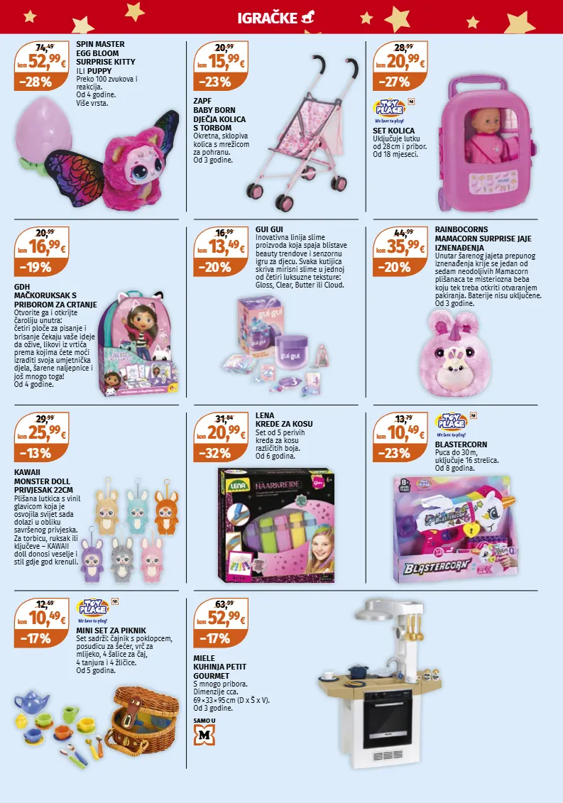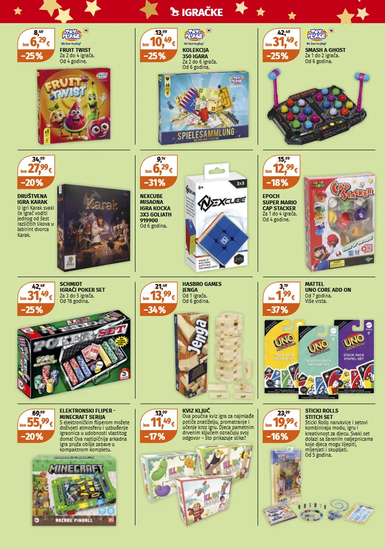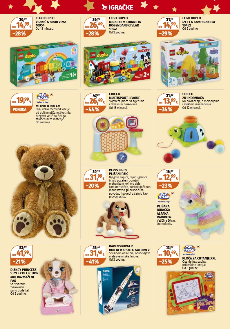 kom 44, 99 € − 29 % 63, 99 kom 20, 99 € − 20 % 26, 49 kom 36, 99 € − 13 % 42, 99 kom 9, 49 € − 32 % 13, 99 kom 52, 99 € − 28 % 74, 49 kom 46, 99 € − 26 % 63, 99 uz ove poklone dječji snovi postaju stvarnost više poklon ideja potražite u katalogu igračaka! poklonimo više radosti! * akcija traje od 3.12. do 6.12.2025. popust se oduzima neposredno na blagajni. dostupno do isteka zaliha. ne može se kombinirati s drugim akcijama. lego fast and furious toyota supra mk4 42204 od 9 godina. nobel wicked glindina bubble kruna od sjajnog metala, sa sjajnim draguljima. od 5 godina. schmidt čovječe ne ljuti se ili yamb za 2 do 8 igrača. od 6 godina. playmobil kombi za prodaju sladoleda sa surf-shopom 71904* od 4 godine. *dostupno u odabranim poslovnicama. popust se oduzima neposredno na blagajni. dostupno do isteka zaliha. ne može se kombinirati s drugim akcijama. simba evi love matovilkin toranj evi s posebno dugom kosom, timmyjem i konjem. od 3 godine. hasbro furby gold glam s 5 načina rada: plesna zabava, papigiranje, vidovitost i još mnogo toga. od 6 godina. 20 % akcija pri kupnji bilo koje slikovnice iznad 5 € , ostvarujete 20 % popusta na sve slikovnice.* 20 % akcija pri kupnji schleich figurica iznad 5 € , ostvarujete 20 % popusta na sve schleich figurice. 2 0 2 5 o d a b r a l e i p r e p o r u č i l e o b i t e l j i 2 0 2 5 k a t e g o r i j a : d r o g e r i j s k i l a n c i samo u samo u adventski kalendar nagradni natječaj više informacija potražite na sljedećoj stranici! katalog igračaka 2025. posjetite nas na www.mueller.hr ili nas pratite na & müller ponude od 1.12. do 14.12.2025.