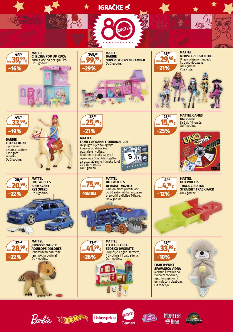 KLEINE WELTEN, kom 33, 99 € − 19 % 41, 99 kom 75, 99 € PONUDA kom 4, 19 € − 12 % 4, 79 kom 28, 99 € − 22 % 37, 49 kom 41, 99 € − 26 % 57, 49 kom 25, 99 € − 21 % 32, 99 kom 39, 99 € − 16 % 47, 99 kom 99, 99 € − 29 % 140, 99 kom 29, 49 € − 21 % 37, 49 kom 15, 99 € − 25 % 21, 49 kom 20, 99 € − 22 % 26, 99 kom 33, 99 € − 10 % 37, 99 BARBIE LUTKA I KONJ S pomičnim uzdama, sedlom i kacigom za lutku. Od 3 godine. MATTEL JURASSIC WORLD AQUILOPS DOLORES Jednostavno dodirnite rep i akcija počinje! Od 4 godine. MATTEL HOT WHEELS TRACK CREATOR STRAIGHT TRACK PACK Od 4 godine. MATTEL LITTLE PEOPLE SEOSKO DVORIŠTE Uključuje 1 figuru farmera, 4 životinje i 1 balu sijena. Od 1 godine. MATTEL CHELSEA POP UP KUĆA Kuća s više od pet igrališta. Od 3 godine. MATTEL BARBIE SUPER OTVORENI KAMPER Od 3 godine. MATTEL MONSTER HIGH LUTKE U jezivo-lijepom izgledu i s puno dodataka. Od 4 godine. Više vrsta. MATTEL GAMES UNO SPIN Za 2 do 10 igrača. Od 7 godine. MATTEL HOT WHEELS AUDI AVANT RS2 SPEED Od 6 godina. FISHER-PRICE SPAVAJUĆA VIDRA Mekana životinja sa zvučnim efektima, nježnim svjetlom i umirujućom glazbom. Od rođenja. MATTEL HOT WHEELS ULTIMATE VOZILO Kamion može primiti više od 20 automobila i može se pretvoriti u divljeg T-Rex-a. Od 4 godine. MATTEL FAMILY SCRABBLE ORIGINAL 2U1 Dvije igre u jednoj! Igrajte klasični Scrabble koji poznajete i volite... ili okrenite ploču za igru i isprobajte Scrabble Together za bržu, ležerniju i timsku igru! Za 2 do 4 igrača. Od 8 godina. SPIELWAREN IGRAČKE