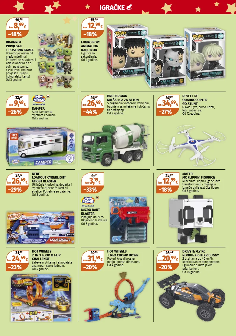 kom 26, 49 € − 44 % 47, 79 kom 3, 19 € − 33 % 4, 79 kom 24, 49 € − 23 % 31, 99 kom 12, 99 € − 18 % 15, 99 kom 20, 99 € − 20 % 26, 49 kom 31, 49 € − 20 % 39, 79 kom 12, 99 € − 18 % 15, 99 kom 9, 49 € − 26 % 12, 99 kom 26, 49 € − 29 % 37, 49 kom 34, 99 € − 27 % 47, 99 kom 8, 99 € − 18 % 10, 99 micro dart blaster ispaljuje do 24 m. uključeno 8 strelica. od 8 godina. funko pop! animation kaiju no8 figurice za sakupljanje. od 3 godine. hot wheels t-rex chomp down projuri kroz divovsku petlju i porazi dinosaura. od 4 godine. kamper auto kamper sa svjetlom i zvukom. od 5 godina. revell rc quadrocopter go stunt 6-axis-gyro, samo uzleti, leti i zabavi se. od 12 godina. bruder man mješalica za beton s nagibnom vozačkom kabinom, bubnjem za miješanje i pločama za pražnjenje. od 3 godine. hot wheels 2-in-1 loop & flip challenge zabava u utrkama i akrobatska avantura - sve u jednom. od 4 godine. drive & fly rc rookie fighter buggy s brzinama do 40 km/h, kontinuiranim tempomatom i gumama s ultra jakim prianjanjem. od 14 godina. nerf loadout cyberlight ghost blaster uključuje 4 odvojiva dodatka i svjetleću cijev te 24 nerf n1 strelice. potrebne su baterije. od 8 godina. brainrot privjesak + posebna karta brainrot je viralni hit među mladima! pripremi se za zabavu i kolekcionarski hit s ovim paketom uz ekskluzivni brainrot privjesak i sjajnu holografsku kartu! od 3 godine. mattel mc flippin' figurice minecraft flippin'figs se lako transformiraju i mijenjaju između dvije različite figure! od 6 godina. spielwaren igračke