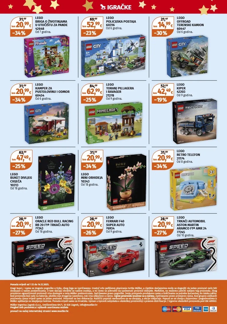 kom 52, 99 € − 23 % 69, 00 kom 47, 49 € − 25 % 63, 99 kom 42, 49 € − 19 % 52, 99 kom 20, 99 € − 27 % 28, 99 kom 20, 99 € − 34 % 31, 99 kom 20, 99 € − 26 % 28, 69 kom 20, 99 € − 27 % 28, 99 kom 14, 99 € − 30 % 21, 49 kom 20, 99 € − 34 % 31, 99 kom 62, 99 € − 25 % 84, 99 kom 20, 99 € − 34 % 31, 99 kom 20, 99 € − 34 % 31, 99 lego policijska postaja 60316 od 6 godina. lego buket divljeg cvijeća 10313 od 18 godina. lego kiper 42203 od 9 godina. lego oracle red bull racing rb 20 f1® trkaći auto 77243 od 18 godina. lego retro telefon 31174 od 8 godina. lego ferrari f40 super auto 76934 od 9 godina. lego trkaći automobil aston martin aramco f1® amr 24 77245 od 10 godina. lego offroad terenski kamion 60447 od 6 godina. lego briga o životinjama u utočištu za pande 42648 od 7 godina. lego mini orhideja 10343 od 18 godina. lego kamper za pustolovinu i odmor 60454 od 6 godina. lego toranj pillagera i ravager 21278 od 9 godina. igračke ponuda vrijedi od 1.12 do 14.12.2025. dragi kupci, i nama se dogode pogreške u tisku, zbog čega se ispričavamo. unatoč vrlo pažljivom planiranju tvrtke müller, u rijetkim slučajevima može se dogoditi da jedan proizvod neće biti dostupan u našim poslovnicama. u tom slučaju obratite se našem osoblju, a mi ćemo se potruditi da spomenuti proizvod dobijete. međutim, ne možemo jamčiti nabavu tog proizvoda. zbog prostorne ograničenosti proizvodi nisu dostupni u svim müller poslovnicama. zadržavamo pravo pogreške. svoje proizvode prodajemo samo u količinama za potrebe kućanstva, do isteka zaliha. kod proizvoda koji rade na baterije, ukoliko nije drugačije navedeno, iste nisu uključene u cijenu. cijene proizvoda izražene su u eurima. zadržavamo pravo promjene cijena. kod grupno oslikanih proizvoda cijena vrijedi samo za jedan proizvod. proizvodi su bez dekoracije. različiti popusti međusobno se ne zbrajaju, a akcije isključuju. popust se ne zbraja s kuponima i pogodnostima iz müller aplikacije za skupljanje bodova. ponuda vrijedi samo za hrvatsku. upisan u upisnik subjekata u ekološkoj proizvodnji s pravom distribucije / trgovine ekoloških proizvoda pod ibk 499922. müller trgovina zagreb d.o.o., oreškovićeva 6h/1, 10 020 zagreb, info@mueller.hr pregled svih poslovnica i njihovih asortimana možete pronaći na našoj internetskoj stranici www.mueller.hr.
