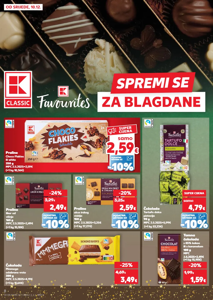 kratkotrajna ponuda samo kratkotrajna ponuda samo kratkotrajna ponuda samo kratkotrajna ponuda kratkotrajna ponuda samo za blagdane za blagdane spremi se od srijede, 10.12. čokolada mmmega odabrane vrste 300 g mpc 2.5.2025=4,19€ (=1 kg 11,64€) -25% 3,49 € 4,69 € -20% 1,59 € 1,99 € (=1 kg 15,90€) tamna čokolada s 85% kakaa ili s karamelom 100 g mpc 2.5.2025=2,49€ dodatna ušteda uz dodatna ušteda uz (=1 kg 17,27€) praline okus irskog viskija 150 g mpc 2.5.2025=3,25€ -20% 2,59 € 3,25 € (=1 kg 53,23€) čokolada tartufo dolce pistacija 90 g mpc 2.5.2025=5,99€ samo super cijena 4,79 € sa o 4,79 samo 4,79 samo 4,7 samo 4,79 samo samo € o € o - - 10% 10% dodatna ušteda uz (=1 kg 15,10€) praline liker od višnje 165 g mpc 2.5.2025=2,49€ -24% 2,49 € 3,29 € - - 10% 10% - - 10% 10% (=1 kg 10,36€) praline choco flakies ili white 250 g mpc 2.5.2025=2,59€ 2,5 9 2,59 € € samo super cijena dodatna ušteda uz - - 10% 10% s8-hr-kw50-oc1-online1_5_3_l-1030-11 8