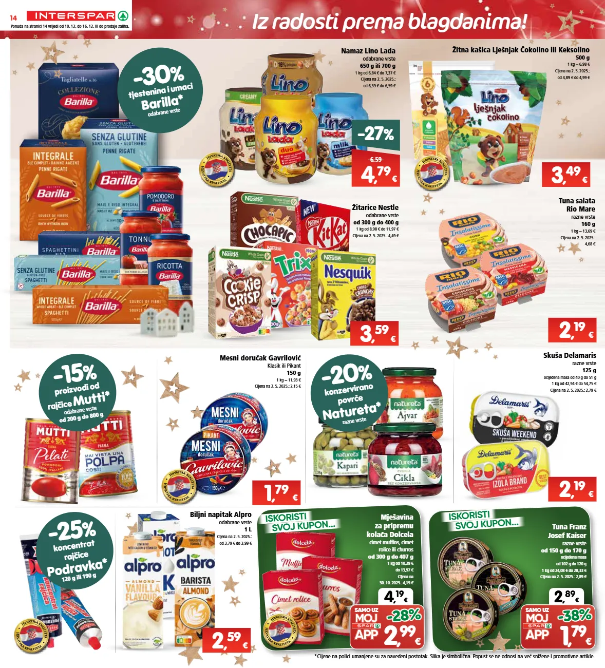 h r v a t s k a k v a l i t e t a h r v a t s k a k v a l i t e t a h r v a t s k a k v a l i t e t a h r v a t s k a k v a l i t e t a h r v a t s k a k v a l i t e t a h r v a t s k a k v a l i t e t a -25 % koncentrat rajčice podravka* 120 g ili 190 g -15 % proizvodi od rajčice mutti* odabrane vrste od 200 g do 800 g -20 % konzervirano povrće natureta* razne vrste -30 % tjestenina i umaci barilla* odabrane vrste iskoristi svoj kupon... iskoristi svoj kupon... 2 , 89 € samo uz 1 , 79 € -38% -38% 4 , 19 € samo uz 2 , 99 € -28% -28% tuna franz josef kaiser razne vrste od 150 g do 170 g ocijeđena masa od 102 g do 120 g 1 kg od 24,08 € do 28,33 € cijena na 2. 5. 2025.: 2,89 € mješavina za pripremu kolača dolcela cimet muffins, cimet rolice ili churros od 300 g do 407 g 1 kg od 10,29 € do 13,97 € cijena na 30. 10. 2025.: 4,19 € namaz lino lada odabrane vrste 650 g ili 700 g 1 kg od 6,84 € do 7,37 € cijena na 2. 5. 2025.: od 6,39 € do 6,59 € žitna kašica lješnjak čokolino ili keksolino 500 g 1 kg = 6,98 € cijena na 2. 5. 2025.: od 4,89 € do 4,99 € žitarice nestle odabrane vrste od 300 g do 400 g 1 kg od 8,98 € do 11,97 € cijena na 2. 5. 2025.: 4,49 € tuna salata rio mare razne vrste 160 g 1 kg = 13,69 € cijena na 2. 5. 2025.: 4,68 € mesni doručak gavrilović klasik ili pikant 150 g 1 kg = 11,93 € cijena na 2. 5. 2025.: 2,15 € biljni napitak alpro odabrane vrste 1 l cijena na 2. 5. 2025.: od 3,79 € do 3,99 € skuša delamaris razne vrste 125 g ocijeđena masa od 40 g do 51 g 1 kg od 42,94 € do 54,75 € cijena na 2. 5. 2025.: 2,79 € 4 , 79 € 6,59 -27 % 3 , 49 € 3 , 59 € h r v a t s k a k v a l i t e t a h r v a t s k a k v a l i t e t a h r v a t s k a k v a l i t e t a h r v a t s k a k v a l i t e t a 1 , 79 € 2 , 59 € 2 , 19 € 2 , 19 € 14 ponuda na stranici 14 vrijedi od 10. 12. do 16. 12. ili do prodaje zaliha. *cijene na polici umanjene su za navedeni postotak. slika je simbolična. popust se ne odnosi na već snižene i promotivne artikle. iz radosti prema blagdanima!