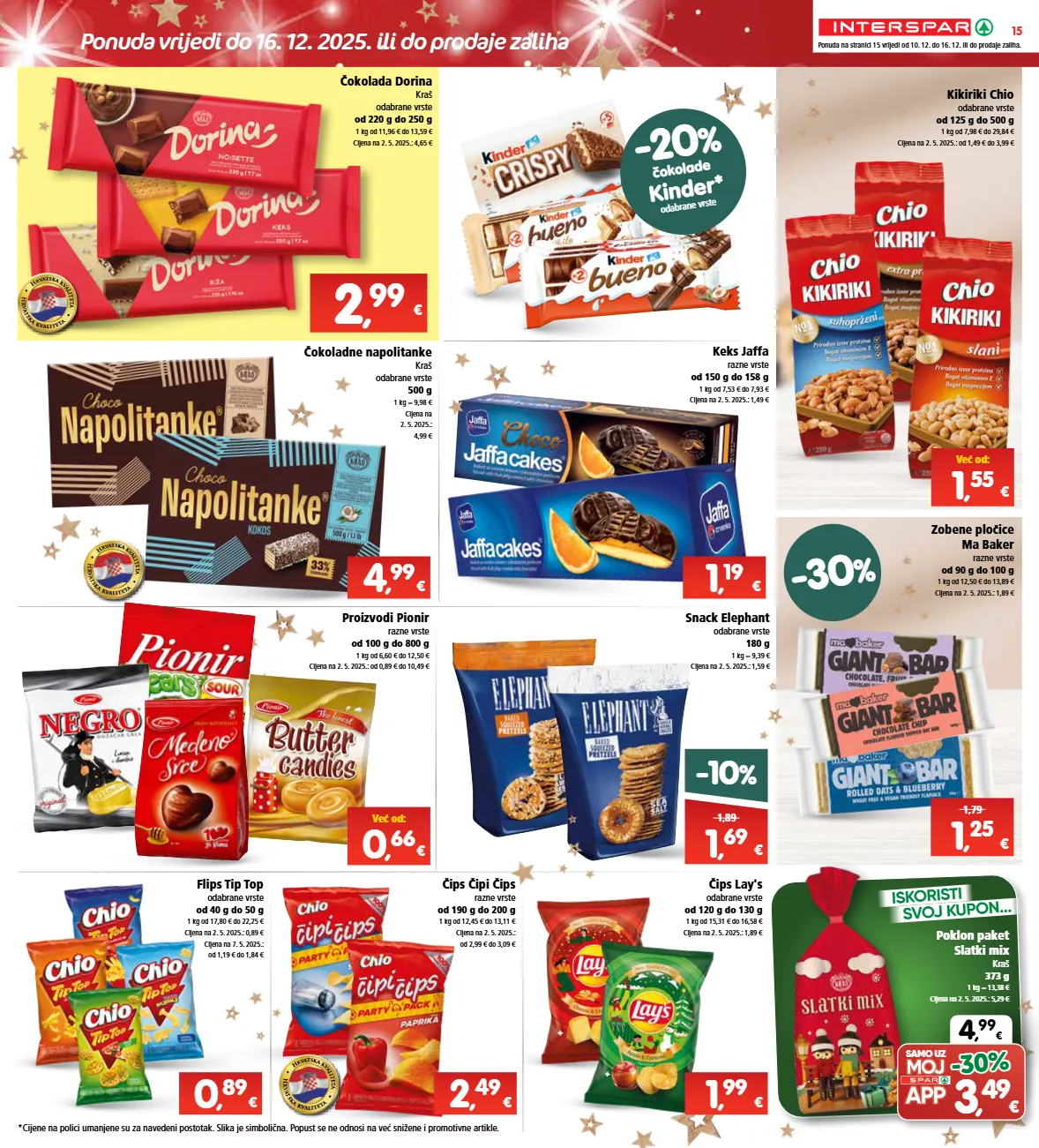iskoristi svoj kupon... h r v a t s k a k v a l i t e t a h r v a t s k a k v a l i t e t a -20 % čokolade kinder* odabrane vrste -30 % 4 , 99 € samo uz 3 , 49 € -30% -30% 1 , 25 € 1,79 čips lay's odabrane vrste od 120 g do 130 g 1 kg od 15,31 € do 16,58 € cijena na 2. 5. 2025.: 1,89 € snack elephant odabrane vrste 180 g 1 kg = 9,39 € cijena na 2. 5. 2025.: 1,59 € proizvodi pionir razne vrste od 100 g do 800 g 1 kg od 6,60 € do 12,50 € cijena na 2. 5. 2025.: od 0,89 € do 10,49 € 1 , 69 € 1,89 -10 % flips tip top odabrane vrste od 40 g do 50 g 1 kg od 17,80 € do 22,25 € cijena na 2. 5. 2025.: 0,89 € cijena na 7. 5. 2025.: od 1,19 € do 1,84 € čips čipi čips razne vrste od 190 g do 200 g 1 kg od 12,45 € do 13,11 € cijena na 2. 5. 2025.: od 2,99 € do 3,09 € čokoladne napolitanke kraš odabrane vrste 500 g 1 kg = 9,98 € cijena na 2. 5. 2025.: 4,99 € čokolada dorina kraš odabrane vrste od 220 g do 250 g 1 kg od 11,96 € do 13,59 € cijena na 2. 5. 2025.: 4,65 € 2 , 99 € 1 , 55 € već od: 0 , 66 € već od: h r v a t s k a k v a l i t e t a h r v a t s k a k v a l i t e t a h r v a t s k a k v a l i t e t a h r v a t s k a k v a l i t e t a 4 , 99 € 0 , 89 € 2 , 49 € 1 , 99 € 1 , 19 € poklon paket slatki mix kraš 373 g 1 kg = 13,38 € cijena na 2. 5. 2025.: 5,29 € keks jaffa razne vrste od 150 g do 158 g 1 kg od 7,53 € do 7,93 € cijena na 2. 5. 2025.: 1,49 € zobene pločice ma baker razne vrste od 90 g do 100 g 1 kg od 12,50 € do 13,89 € cijena na 2. 5. 2025.: 1,89 € kikiriki chio odabrane vrste od 125 g do 500 g 1 kg od 7,98 € do 29,84 € cijena na 2. 5. 2025.: od 1,49 € do 3,99 € 15 ponuda na stranici 15 vrijedi od 10. 12. do 16. 12. ili do prodaje zaliha. *cijene na polici umanjene su za navedeni postotak. slika je simbolična. popust se ne odnosi na već snižene i promotivne artikle. ponuda vrijedi do 16. 12. 2025. ili do prodaje zaliha