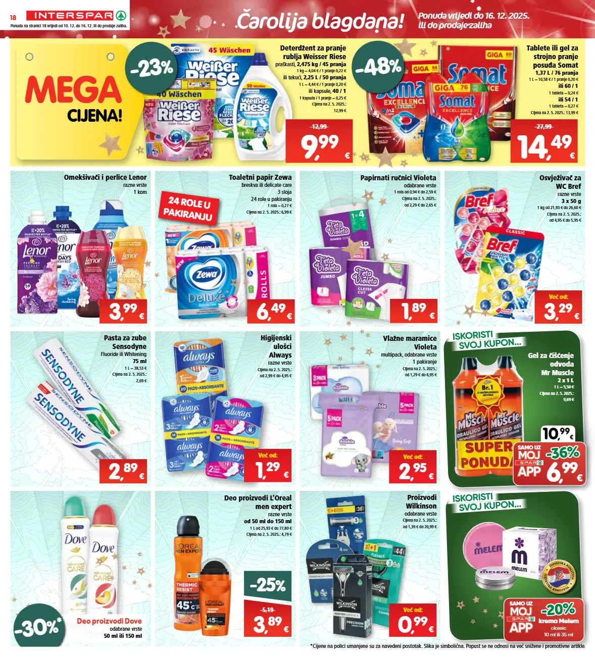 10 , 99 € iskoristi svoj kupon... samo uz 6 , 99 € -36% -36% mega cijena! *cijene na polici umanjene su za navedeni postotak. slika je simbolična. popust se ne odnosi na već snižene i promotivne artikle. 24 role u pakiranju deterdžent za pranje rublja weisser riese praškasti, 2,475 kg / 45 pranja 1 kg = 4,04 € / 1 pranje 0,22 € ili tekući, 2,25 l / 50 pranja 1 l = 4,44 € / 1 pranje 0,20 € ili kapsule, 40 / 1 1 kapsula / 1 pranje = 0,25 € cijena na 2. 5. 2025.: 12,99 € tablete ili gel za strojno pranje posuđa somat 1,37 l / 76 pranja 1 l = 10,58 € / 1 pranje 0,20 € ili 60 / 1 1 tableta = 0,24 € ili 54 / 1 1 tableta = 0,27 € cijena na 2. 5. 2025.: 13,99 € 9 , 99 € 12,99 14 , 49 € 27,99 -23 % -48 % toaletni papir zewa breskva ili delicate care 3 sloja 24 role u pakiranju 1 rola = 0,27 € cijena na 2. 5. 2025.: 6,99 € osvježivač za wc bref razne vrste 3 x 50 g 1 kg od 21,93 € do 26,60 € cijena na 2. 5. 2025.: od 4,95 € do 5,95 € deo proizvodi l’oreal men expert razne vrste od 50 ml do 150 ml 1 l od 25,93 € do 77,80 € cijena na 2. 5. 2025.: 4,79 € gel za čišćenje odvoda mr muscle 2 x 1 l 1 l = 5,50 € cijena na 2. 5. 2025.: 9,69 € 3 , 89 € 5,19 -25 % 2 , 95 € već od: 0 , 99 € već od: 1 , 29 € već od: papirnati ručnici violeta odabrane vrste 1 rola od 0,94 € do 2,59 € cijena na 2. 5. 2025.: od 2,29 € do 2,65 € pasta za zube sensodyne fluoride ili whitening 75 ml 1 l = 38,53 € cijena na 2. 5. 2025.: 2,69 € vlažne maramice violeta multipack, odabrane vrste 1 pakiranje cijena na 2. 5. 2025.: od 1,29 € do 6,95 € proizvodi wilkinson odabrane vrste cijena na 2. 5. 2025.: od 1,39 € do 20,99 € higijenski ulošci always razne vrste cijena na 2. 5. 2025.: od 2,99 € do 4,95 € h r v a t s k a k v a l i t e t a h r v a t s k a k v a l i t e t a 3 , 29 € već od: omekšivači i perlice lenor razne vrste 1 kom 3 , 99 € 6 , 49 € 2 , 89 € 1 , 89 € iskoristi svoj kupon... samo uz -20% -20% krema melem classic 10 ml ili 35 ml deo proizvodi dove odabrane vrste 50 ml ili 150 ml -30 % * ponuda na stranici 18 vrijedi od x. x. do x. x. ili do prodaje zaliha. ponuda na stranici 18 vrijedi od 6. 11. do 12. 11. ili do prodaje zaliha. 18 18 ponuda na stranici 18 vrijedi od 10. 12. do 16. 12. ili do prodaje zaliha. čarolija blagdana! ponuda vrijedi do 16. 12. 2025. ili do prodaje zaliha