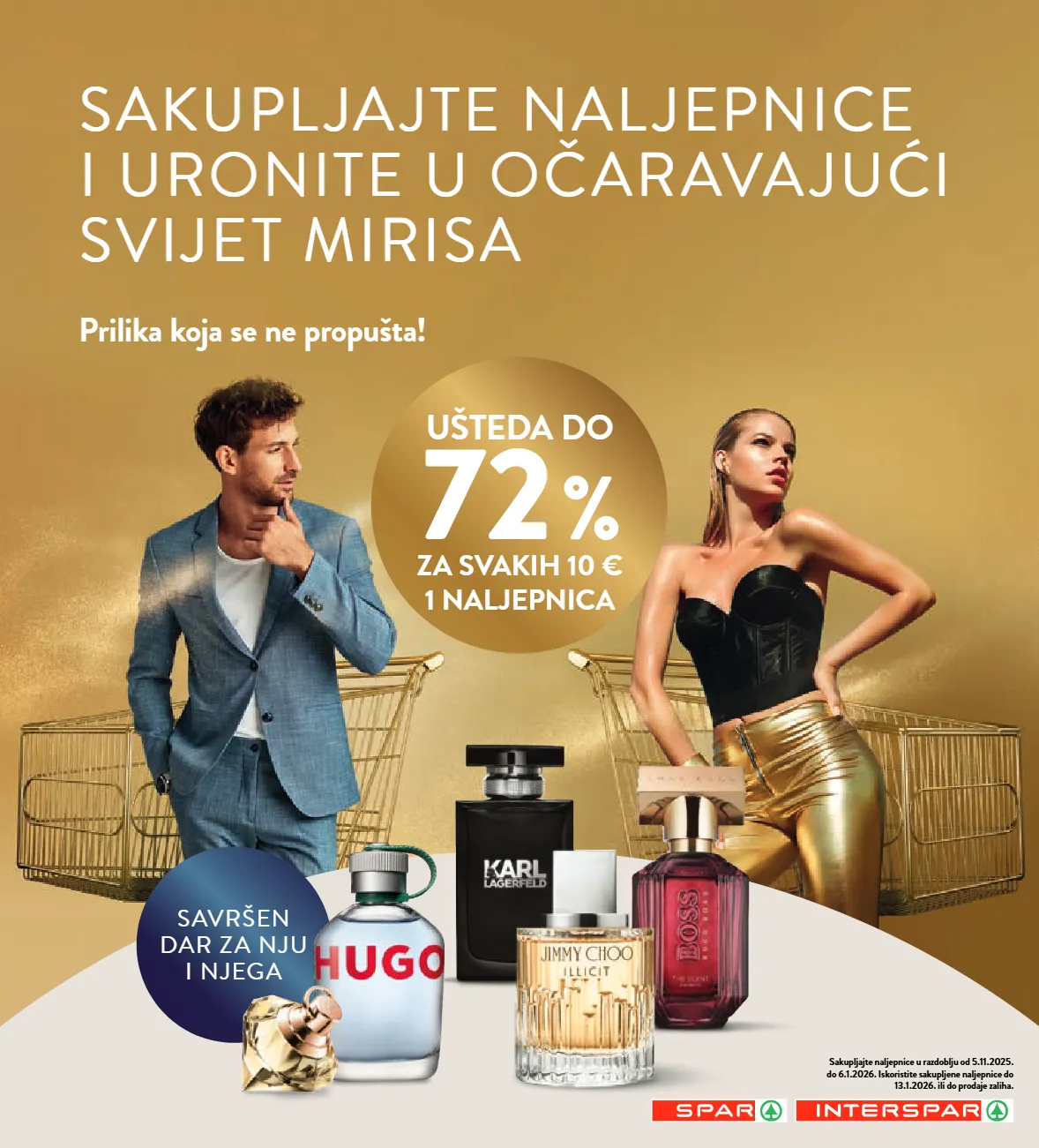UŠTEDA DO ZA SVAKIH 10 € 1 NALJEPNICA SAKUPL JA JTE NAL JEPNICE I URONITE U OČARAVA JUĆI SVIJET MIRISA Prilika koja se ne propušta! SAVRŠEN DAR ZA NJU I NJEGA Sakupljajte naljepnice u razdoblju od 5.11.2025. do 6.1.2026. Iskoristite sakupljene naljepnice do 13.1.2026. ili do prodaje zaliha.