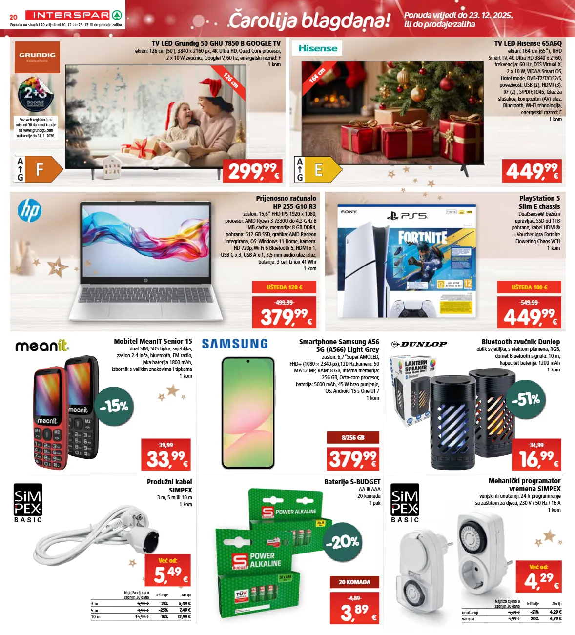 164 cm 126 cm tv led grundig 50 ghu 7850 b google tv ekran: 126 cm (50¨), 3840 x 2160 px, 4k ultra hd, quad core procesor, 2 x 10 w zvučnici, googletv, 60 hz, energetski razred: f 1 kom tv led hisense 65a6q ekran: 164 cm (65”), uhd smart tv, 4k ultra hd 3840 x 2160, frekvencija: 60 hz, dts virtual x, 2 x 10 w, vidaa smart os, hotel mode, dvb-t2/t/c/s2/s, povezivost: usb (2), hdmi (3), rf (2) , s/pdif, rj45, izlaz za slušalice, kompozitni (av) ulaz, bluetooth, wi-fi tehnologija, energetski razred: e 1 kom 299 , 99 € 449 , 99 € 379 , 99 € 499,99 449 , 99 € 549,99 16 , 99 € 34,99 3 , 89 € 4,89 33 , 99 € 39,99 -51 % -20 % -15 % mehanički programator vremena simpex vanjski ili unutarnji, 24 h programiranje sa zaštitom za djecu, 230 v / 50 hz / 16 a 1 kom najniža cijena u zadnjih 30 dana jeftinije akcija 3 m 6,99 € -21% 5,49 € 5 m 9,99 € -25% 7,49 € 10 m 15,99 € -18% 12,99 € najniža cijena u zadnjih 30 dana jeftinije akcija unutarnji 5,49 € -21% 4,29 € vanjski 5,99 € -20% 4,79 € 4 , 29 € već od: 5 , 49 € već od: produžni kabel simpex 3 m, 5 m ili 10 m 1 kom smartphone samsung a56 5g (a566) light grey zaslon: 6,7”super amoled, fhd+ (1080 × 2340 px),120 hz,kamera: 50 mp/12 mp, ram: 8 gb, interna memorija: 256 gb, octa-core procesor, baterija: 5000 mah, 45 w brzo punjenje, os: android 15 s one ui 7 1 kom prijenosno računalo hp 255 g10 r3 zaslon: 15,6” fhd ips 1920 x 1080, procesor: amd ryzen 3 7330u do 4.3 ghz 8 mb cache, memorija: 8 gb ddr4, pohrana: 512 gb ssd, grafika: amd radeon integrirana, os: windows 11 home, kamera: hd 720p, wi fi 6 bluetooth 5, hdmi x 1, usb c x 3, usb a x 1, 3.5 mm audio ulaz izlaz, baterija: 3 cell li ion 41 whr 1 kom bluetooth zvučnik dunlop oblik svjetiljke, s efektom plamena, rgb, domet bluetooth signala: 10 m, kapacitet baterije: 1200 mah 1 kom playstation 5 slim e chassis dualsense® bežični upravljač, ssd od 1tb pohrane, kabel hdmi® +voucher igra fortnite flowering chaos vch 1 kom baterije s-budget aa ili aaa 20 komada 1 pak mobitel meanit senior 15 dual sim, sos tipka, svjetiljka, zaslon 2.4 inča, bluetooth, fm radio, jaka baterija 1800 mah, izbornik s velikim znakovima i tipkama 1 kom 379 , 99 € 20 komada *uz web registraciju u roku od 30 dana od kupnje na www.grundig5.com najkasnije do 31. 1. 2026. ušteda 100 € ušteda 120 € 8/256 gb ponuda na stranici 20 vrijedi od x. x. do x. x. ili do prodaje zaliha. ponuda na stranici 20 vrijedi od 6. 11. do 12. 11. ili do prodaje zaliha. 20 20 ponuda na stranici 20 vrijedi od 10. 12. do 23. 12. ili do prodaje zaliha. čarolija blagdana! ponuda vrijedi do 23. 12. 2025. ili do prodaje zaliha