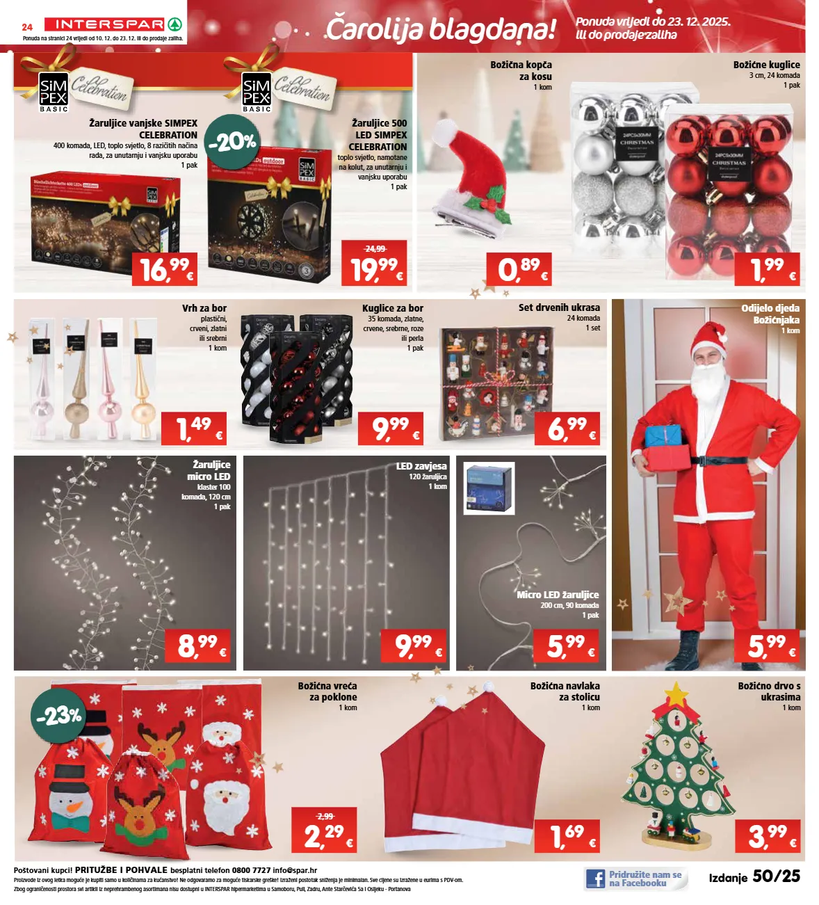 ponuda na stranici 24 vrijedi od x. x. do x. x. ili do prodaje zaliha. ponuda na stranici 24 vrijedi od 8. 1. do 21. 1. ili do prodaje zaliha. 24 izdanje 50/25 ponuda na stranici 24 vrijedi od x. x. do x. x. ili do prodaje zaliha. ponuda na stranici 24 vrijedi od 10. 12. do 23. 12. ili do prodaje zaliha. 24 poπtovani kupci! prituæbe i pohvale besplatni telefon 0800 7727 info@spar.hr proizvode iz ovog letka moguće je kupiti samo u količinama za kućanstvo! ne odgovaramo za moguće tiskarske greške! izraženi postotak sniženja je minimalan. sve cijene su izražene u eurima s pdv-om. zbog ograničenosti prostora svi artikli iz neprehrambenog asortimana nisu dostupni u interspar hipermarketima u samoboru, puli, zadru, ante starčevića 5a i osijeku - portanova pridružite nam se na facebooku božićne kuglice 3 cm, 24 komada 1 pak led zavjesa 120 žaruljica 1 kom kuglice za bor 35 komada, zlatne, crvene, srebrne, roze ili perla 1 pak vrh za bor plastični, crveni, zlatni ili srebrni 1 kom set drvenih ukrasa 24 komada 1 set žaruljice vanjske simpex celebration 400 komada, led, toplo svjetlo, 8 razičitih načina rada, za unutarnju i vanjsku uporabu 1 pak micro led žaruljice 200 cm, 90 komada 1 pak odijelo djeda božićnjaka 1 kom božićna navlaka za stolicu 1 kom božićno drvo s ukrasima 1 kom božična kopča za kosu 1 kom božićna vreća za poklone 1 kom žaruljice 500 led simpex celebration toplo svjetlo, namotane na kolut, za unutarnju i vanjsku uporabu 1 pak 5 , 99 € 0 , 89 € 1 , 69 € 3 , 99 € 5 , 99 € 6 , 99 € 1 , 49 € 9 , 99 € 16 , 99 € 9 , 99 € -23 % -20 % 2 , 29 € 2,99 19 , 99 € 24,99 1 , 99 € žaruljice micro led klaster 100 komada, 120 cm 1 pak 8 , 99 € ponuda vrijedi do 23. 12. 2025. ili do prodaje zaliha čarolija blagdana!