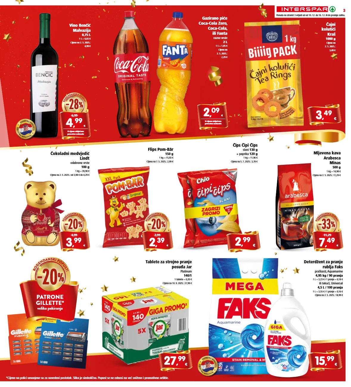 *cijene na polici umanjene su za navedeni postotak. slika je simbolična. popust se ne odnosi na već snižene i promotivne artikle. r o đ e n d a n s k a c i j e n a ! -20 % 3 , 99 € 4,99 čokoladni medvjedić lindt odabrane vrste 100 g 1 kg = 39,90 € cijena na 2. 5. 2025.: od 3,98 € do 4,29 € 2 , 09 € u cijenu uključena povratna naknada r o đ e n d a n s k i p o p u s t ! -20 % patrone gillette* velika pakiranja r o đ e n d a n s k a c i j e n a ! -20 % 2 , 39 € 2,99 r o đ e n d a n s k a c i j e n a ! -33 % 7 , 49 € 11,29 čajni kolutići kraš 1000 g cijena na 2. 5. 2025.: 3,49 € gazirano piće coca-cola zero, coca-cola, ili fanta razne vrste 2 l 1 l = 1,05 € cijena na 2. 5. 2025.: 2,29 € r o đ e n d a n s k a c i j e n a ! 4 , 99 € 6,99 u cijenu uključena povratna naknada -28 % vino benčić malvazija 0,75 l 1 l = 6,65 € cijena na 2. 5. 2025.: 4,99 € 27 , 99 € 2 , 99 € 15 , 99 € 3 , 49 € h r v a t s k a k v a l i t e t a h r v a t s k a k v a l i t e t a h r v a t s k a k v a l i t e t a h r v a t s k a k v a l i t e t a mljevena kava arabesca minas 500 g 1 kg = 14,98 € cijena na 2. 5. 2025.: 11,29 € deterdžent za pranje rublja faks praškasti, aquamarine 4,95 kg / 90 pranja 1 l = 3,23 € / 1 pranje = 0,18 € ili tekući, universal 4,5 l / 100 pranja 1 l = 3,55 € / 1 pranje = 0,16 € cijena na 2. 5. 2025.: 18,99 € tablete za strojno pranje posuđa jar platinum 140/1 1 tableta = 0,20 € cijena na 10. 9. 2025.: 27,99 € čips čipi čips slani 130 g + paprika 120 g 1 kg = 11,96 € cijena na 5. 7. 2025.: 3,78 € flips pom-bär 150 g 1 kg = 15,93 € cijena na 7. 5. 2025.: 2,99 € ponuda na stranici 3 vrijedi od od 10. 12. do 16. 12. ili do prodaje zaliha. 3