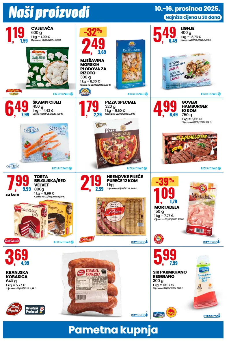 naši proizvodi pametna kupnja 10.-16. prosinca 2025. najniža cijena u 30 dana 1 , 19 1,59 cvjetača 600 g 1 kg = 1,99 € cijena na 02/05/2025: 1,59 € 2 , 49 3,69 -32 % mješavina morskih plodova za rižoto 300 g 1 kg = 8,30 € cijena na 02/05/2025: 3,69 € 5 , 49 6,49 lignje 400 g 1 kg = 13,73 € cijena na 02/05/2025: 5,99 € 6 , 49 7,99 škampi cijeli 450 g 1 kg = 14,43 € cijena na 02/05/2025: 7,30 € 1 , 79 2,29 pizza speciale 320 g 1 kg = 5,60 € cijena na 02/05/2025: 2,19 € 4 , 99 6,49 goveði hamburger 10 kom 750 g 1 kg = 6,66 € cijena na 02/05/2025: 5,31 € 7 , 99 9,99 za kom torta belgijska/red velvet 800g 1 kg = 9,99 € cijena na 02/05/2025: 9,99 € 1 , 09 1,79 mortadela 150 g 1 kg = 7,27 € cijena na 02/05/2025: 1,79 € 2 , 19 2,59 hrenovke pileće pureće 12 kom 1 kg cijena na 02/05/2025: 2,69 € 3 , 69 4,99 kranjska kobasica 640 g 1 kg = 5,77 € cijena na 02/05/2025: 4,99 € -39 % 5 , 99 7,99 • p r o t e c t e d d e s i g n a t i o n o f o r i g i n • sir parmigiano reggiano 300 g 1 kg = 19,97 € cijena na 02/05/2025: 7,69 €