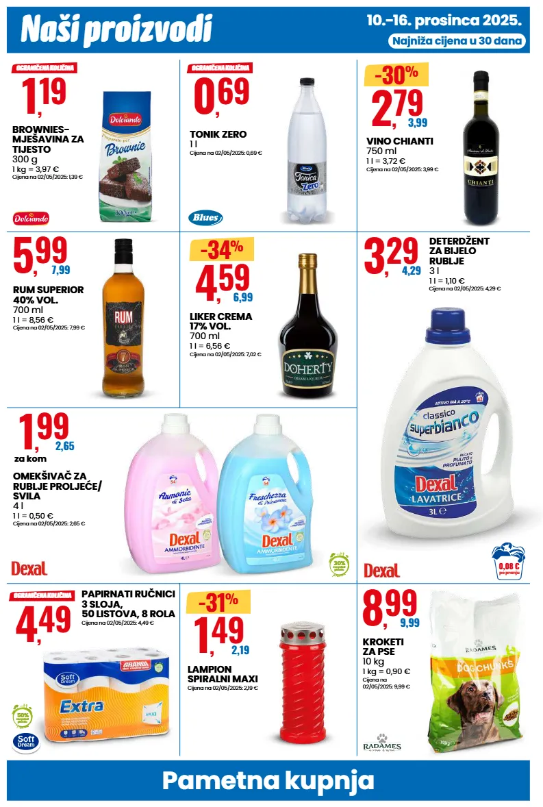 naši proizvodi pametna kupnja 10.-16. prosinca 2025. najniža cijena u 30 dana 0 , 69 ograničena količina tonik zero 1 l cijena na 02/05/2025: 0,69 € 2 , 79 3,99 -30 % vino chianti 750 ml 1 l = 3,72 € cijena na 02/05/2025: 3,99 € 4 , 59 6,99 -34 % liker crema 17% vol. 700 ml 1 l = 6,56 € cijena na 02/05/2025: 7,02 € 3 , 29 4,29 po pranju deterdžent za bijelo rublje 3 l 1 l = 1,10 € cijena na 02/05/2025: 4,29 € 1 , 99 2,65 za kom omekšivač za rublje proljeće/ svila 4 l 1 l = 0,50 € cijena na 02/05/2025: 2,65 € 1 , 49 2,19 -31 % lampion spiralni maxi cijena na 02/05/2025: 2,19 € 4 , 49 50% recycled plastic ograničena količina papirnati ručnici 3 sloja, 50 listova, 8 rola cijena na 02/05/2025: 4,49 € 30% recycled plastic 0,08 € 5 , 99 7,99 rum superior 40% vol. 700 ml 1 l = 8,56 € cijena na 02/05/2025: 7,99 € 8 , 99 9,99 kroketi za pse 10 kg 1 kg = 0,90 € cijena na 02/05/2025: 9,99 € 1 , 19 ograničena količina brownies- mješavina za tijesto 300 g 1 kg = 3,97 € cijena na 02/05/2025: 1,39 €