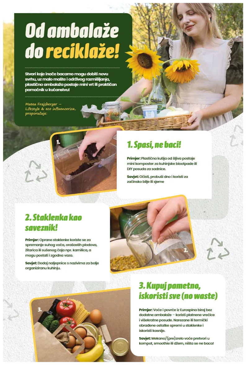 od ambalaže do reciklaže! stvari koje inače bacamo mogu dobiti novu svrhu, uz malo mašte i održivog razmišljanja, plastična ambalaža postaje mini vrt ili praktičan pomoćnik u kućanstvu! matea frajsberger – lifestyle & eco influencerica, preporučuje: 3. kupuj pametno, iskoristi sve (no waste) primjer: voće i povrće iz eurospina biraj bez dodatne ambalaže – koristi platnene vrećice i višekratne posude. narezane ili termički obrađene ostatke spremi u staklenke i iskoristi kasnije. savjet: mekano/(pre)zrelo voće pretvori u kompot, smoothie ili džem, ništa se ne baca! 1. spasi, ne baci! primjer: plastična kutija od šljiva postaje mini komposter za kuhinjske biootpade ili diy posuda za sadnice. savjet: očisti, probuši dno i koristi za začinsko bilje ili sjeme 2. staklenka kao saveznik! primjer: oprane staklenke koriste se za spremanje suhog voća, orašastih plodova, žitarica ili sušenog čaja npr. kamilica, a mogu postati i zgodna vaza. savjet: dodaj naljepnice s nazivima za bolje organiziranu kuhinju. 1. 2. 3.