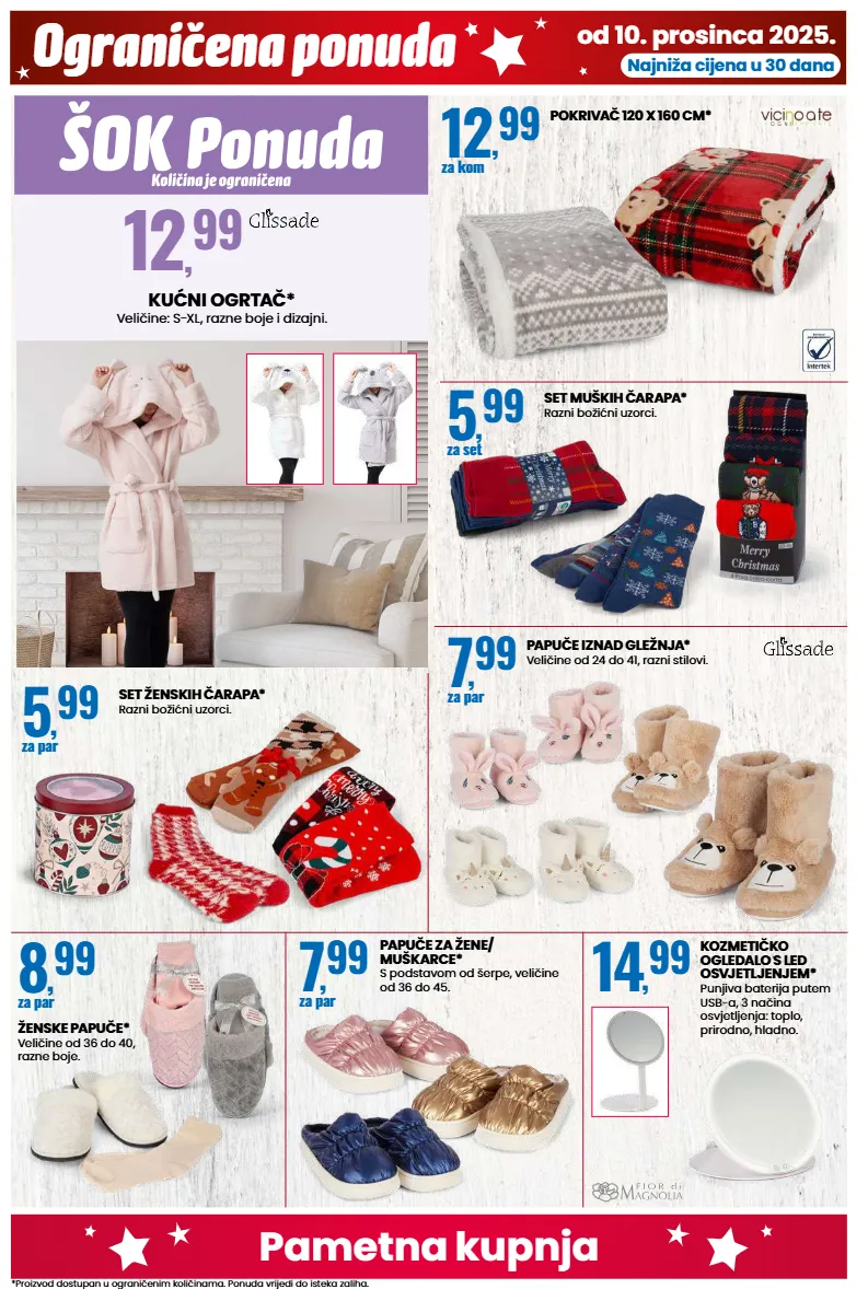 od 10. prosinca 2025. pametna kupnja ograničena ponuda *proizvod dostupan u ograničenim količinama. ponuda vrijedi do isteka zaliha. najniža cijena u 30 dana kućni ogrtač* veličine: s-xl, razne boje i dizajni. 12 , 99 papuče iznad gležnja* veličine od 24 do 41, razni stilovi. 7 , 99 za par set muških čarapa* razni božićni uzorci. 5 , 99 za set set ženskih čarapa* razni božićni uzorci. 5 , 99 za par kozmetičko ogledalo s led osvjetljenjem* punjiva baterija putem usb-a, 3 načina osvjetljenja: toplo, prirodno, hladno. 14 , 99 ženske papuče* veličine od 36 do 40, razne boje. 8 , 99 za par papuče za žene/ muškarce* s podstavom od šerpe, veličine od 36 do 45. 7 , 99 za par pokrivač 120 x 160 cm* 12 , 99 za kom