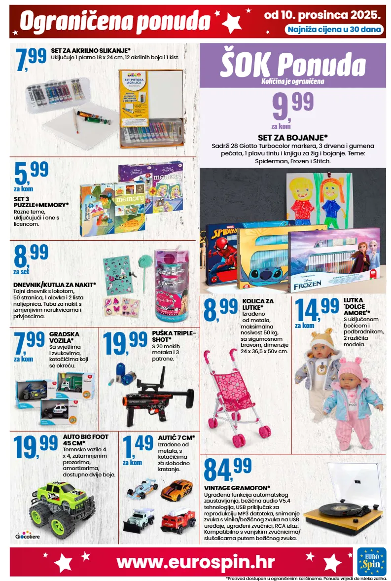 www.eurospin.hr Ograničena ponuda *Proizvod dostupan u ograničenim količinama. Ponuda vrijedi do isteka zaliha. od 10. prosinca 2025. Najniža cijena u 30 dana SET ZA BOJANJE* Sadrži 28 Giotto Turbocolor markera, 3 drvena i gumena pečata, 1 plavu tintu i knjigu za žig i bojanje. Teme: Spiderman, Frozen i Stitch. 9 , 99 za kom AUTO BIG FOOT 45 CM* Terensko vozilo 4 x 4, zatamnjenim prozorima, amortizerima, dostupne dvije boje. 19 , 99 GRADSKA VOZILA* Sa svjetlima i zvukovima, kotačićima koji se okreću. 7 , 99 za kom SET 3 PUZZLE+MEMORY* Razne teme, uključujući i one s licencom. 5 , 99 za kom LUTKA 'DOLCE AMORE'* S uključenom bočicom i podbradnikom, 2 različita modela. 14 , 99 za kom KOLICA ZA LUTKE* Izrađeno od metala, maksimalna nosivost 50 kg, sa sigurnosnom bravom, dimenzije 24 x 36,5 x 50v cm. 8 , 99 PUŠKA TRIPLE- SHOT* S 20 mekih metaka i 3 patrone. 19 , 99 SET ZA AKRILNO SLIKANJE* Uključuje 1 platno 18 x 24 cm, 12 akrilnih boja i 1 kist. 7 , 99 VINTAGE GRAMOFON* Ugrađena funkcija automatskog zaustavljanja, bežična audio V5.4 tehnologija, USB priključak za reprodukciju MP3 datoteka, snimanje zvuka s vinila/bežičnog zvuka na USB uređaje, ugrađeni zvučnici, RCA izlaz. Kompatibilno s vanjskim zvučnicima/ slušalicama putem bežičnog zvuka. 84 , 99 AUTIĆ 7 CM* Izrađeno od metala, s kotačićima za slobodno kretanje. 1 , 49 za kom DNEVNIK/KUTIJA ZA NAKIT* Tajni dnevnik s lokotom, 50 stranica, 1 olovka i 2 lista naljepnica. Tuba za nakit s izmjenjivim narukvicama i privjescima. 8 , 99 za set