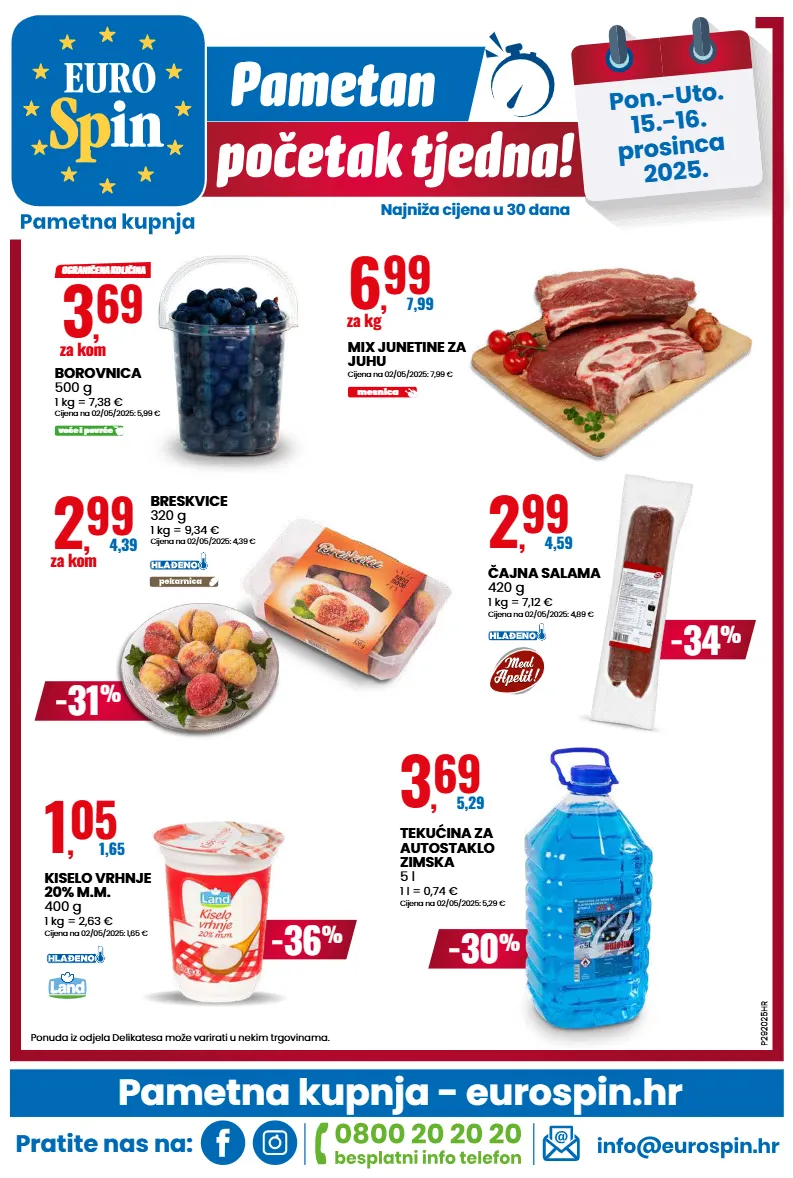 pametna kupnja - eurospin.hr pratite nas na: najniža cijena u 30 dana pon.-uto. 15.-16. prosinca 2025. p292025hr ponuda iz odjela delikatesa može varirati u nekim trgovinama. -31 % -30 % -36 % 6 , 99 7,99 za kg mix junetine za juhu cijena na 02/05/2025: 7,99 € mesnica breskvice 320 g 1 kg = 9,34 € cijena na 02/05/2025: 4,39 € 2 , 99 4,39 za kom 1 , 05 1,65 kiselo vrhnje 20% m.m. 400 g 1 kg = 2,63 € cijena na 02/05/2025: 1,65 € 3 , 69 5,29 tekućina za autostaklo zimska 5 l 1 l = 0,74 € cijena na 02/05/2025: 5,29 € -34 % 2 , 99 4,59 čajna salama 420 g 1 kg = 7,12 € cijena na 02/05/2025: 4,89 € borovnica 500 g 1 kg = 7,38 € cijena na 02/05/2025: 5,99 € 3 , 69 za kom voće i povrće ograničena količina