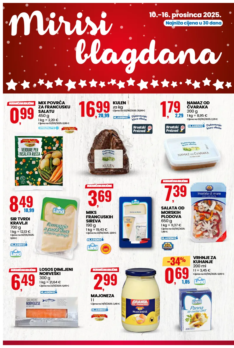 10.-16. prosinca 2025. najniža cijena u 30 dana 0 , 99 ograničena količina mix povrća za francusku salatu 450 g 1 kg = 2,20 € cijena na 02/05/2025: 0,99 € 16 , 99 20,99 kulen za kg cijena na 02/05/2025: 20,99 € 1 , 79 2,29 namaz od čvaraka 200 g 1 kg = 8,95 € cijena na 02/05/2025: 2,29 € 8 , 49 10,99 sir tvrdi kravlji 700 g 1 kg = 12,13 € cijena na 02/05/2025: 9,99 € 7 , 39 ograničena količina salata od morskih plodova 650 g 1 kg = 11,37 € cijena na 02/05/2025: 7,49 € 0 , 69 1,05 -34 % vrhnje za kuhanje 200 ml 1 l = 3,45 € cijena na 02/05/2025: 0,99 € 2 , 99 ograničena količina majoneza 1 l cijena na 14/11/2025: 3,49 € 3 , 69 ograničena količina miks francuskih sireva 190 g 1 kg = 19,43 € cijena na 22/10/2025: 3,69 € • p r o t e c t e d d e s i g n a t i o n o f o r i g i n • 6 , 49 ograničena količina losos dimljeni norveški 300 g 1 kg = 21,64 € cijena na 22/11/2025: 6,49 €