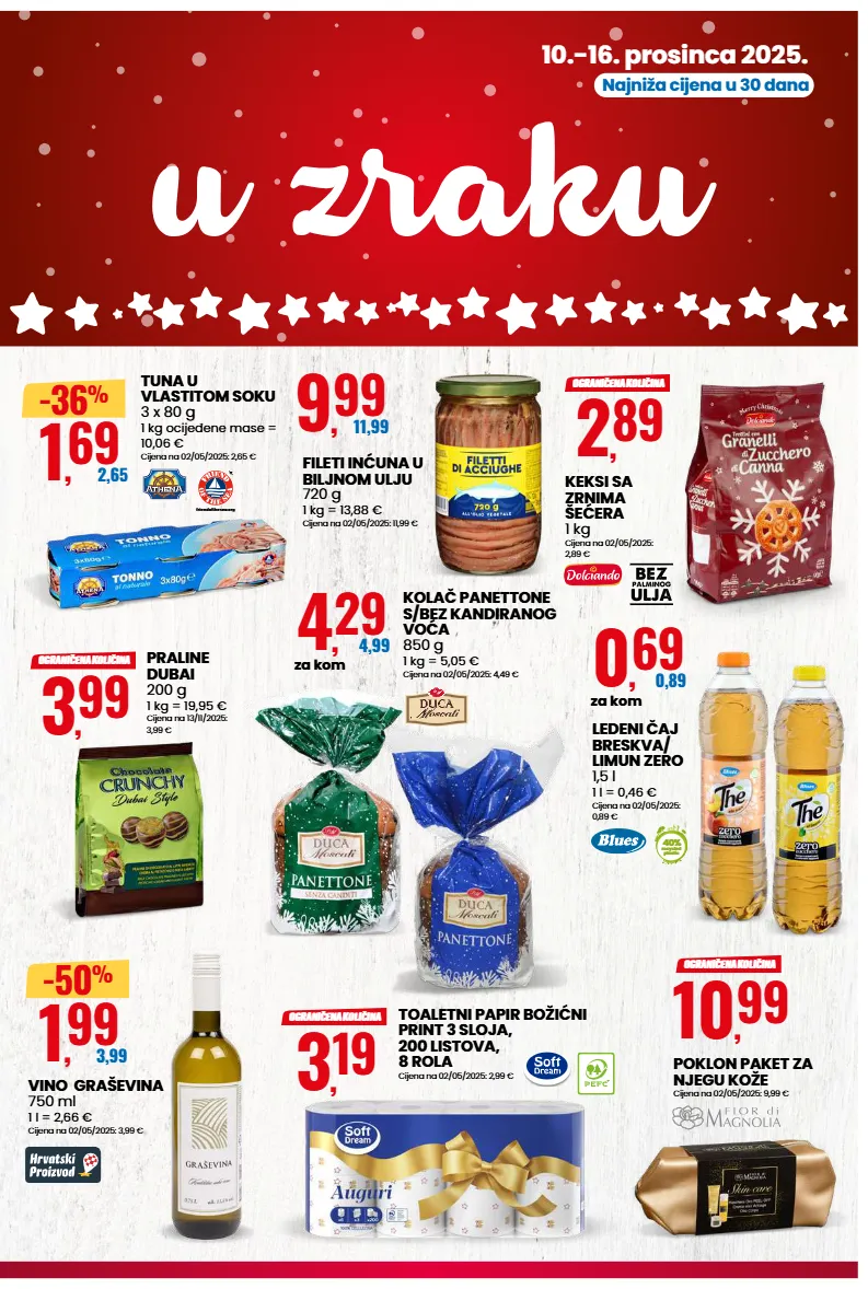10.-16. prosinca 2025. najniža cijena u 30 dana 1 , 69 2,65 friendofthesea.org tuna u vlastitom soku 3 x 80 g 1 kg ocijeđene mase = 10,06 € cijena na 02/05/2025: 2,65 € 4 , 29 4,99 za kom kolač panettone s/bez kandiranog voća 850 g 1 kg = 5,05 € cijena na 02/05/2025: 4,49 € 2 , 89 ograničena količina keksi sa zrnima šećera 1 kg cijena na 02/05/2025: 2,89 € 3 , 99 ograničena količina praline dubai 200 g 1 kg = 19,95 € cijena na 13/11/2025: 3,99 € 0 , 69 0,89 za kom 40% recycled plastic ledeni čaj breskva/ limun zero 1,5 l 1 l = 0,46 € cijena na 02/05/2025: 0,89 € 1 , 99 3,99 -50 % vino graševina 750 ml 1 l = 2,66 € cijena na 02/05/2025: 3,99 € 3 , 19 ograničena količina toaletni papir božićni print 3 sloja, 200 listova, 8 rola cijena na 02/05/2025: 2,99 € 10 , 99 ograničena količina poklon paket za njegu kože cijena na 02/05/2025: 9,99 € 9 , 99 11,99 fileti inćuna u biljnom ulju 720 g 1 kg = 13,88 € cijena na 02/05/2025: 11,99 € -36 %