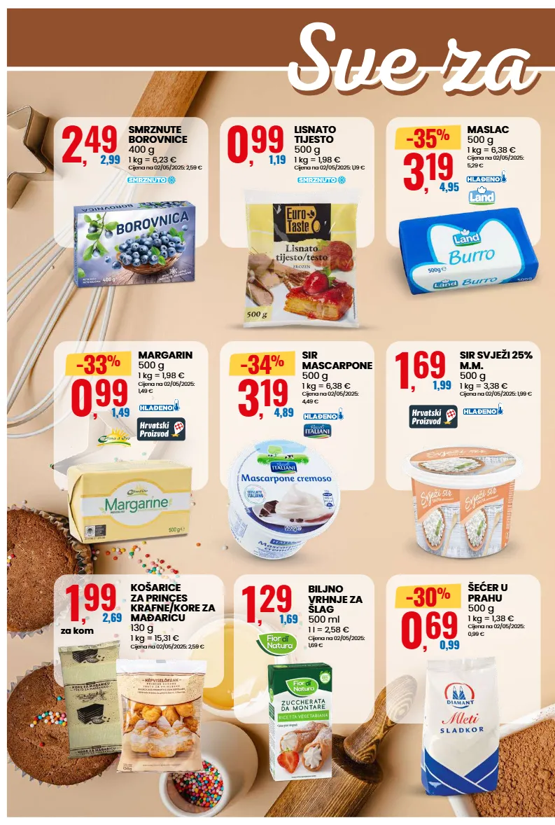 2 , 49 2,99 smrznute borovnice 400 g 1 kg = 6,23 € cijena na 02/05/2025: 2,59 € 0 , 99 1,19 lisnato tijesto 500 g 1 kg = 1,98 € cijena na 02/05/2025: 1,19 € 3 , 19 4,95 maslac 500 g 1 kg = 6,38 € cijena na 02/05/2025: 5,29 € 0 , 99 1,49 -33 % margarin 500 g 1 kg = 1,98 € cijena na 02/05/2025: 1,49 € 3 , 19 4,89 -34 % sir mascarpone 500 g 1 kg = 6,38 € cijena na 02/05/2025: 4,49 € 1 , 69 1,99 sir svježi 25% m.m. 500 g 1 kg = 3,38 € cijena na 02/05/2025: 1,99 € 1 , 29 1,69 biljno vrhnje za šlag 500 ml 1 l = 2,58 € cijena na 02/05/2025: 1,69 € 0 , 69 0,99 -30 % šećer u prahu 500 g 1 kg = 1,38 € cijena na 02/05/2025: 0,99 € -35 % 1 , 99 2,69 za kom košarice za princes krafne/kore za maðaricu 130 g 1 kg = 15,31 € cijena na 02/05/2025: 2,59 €