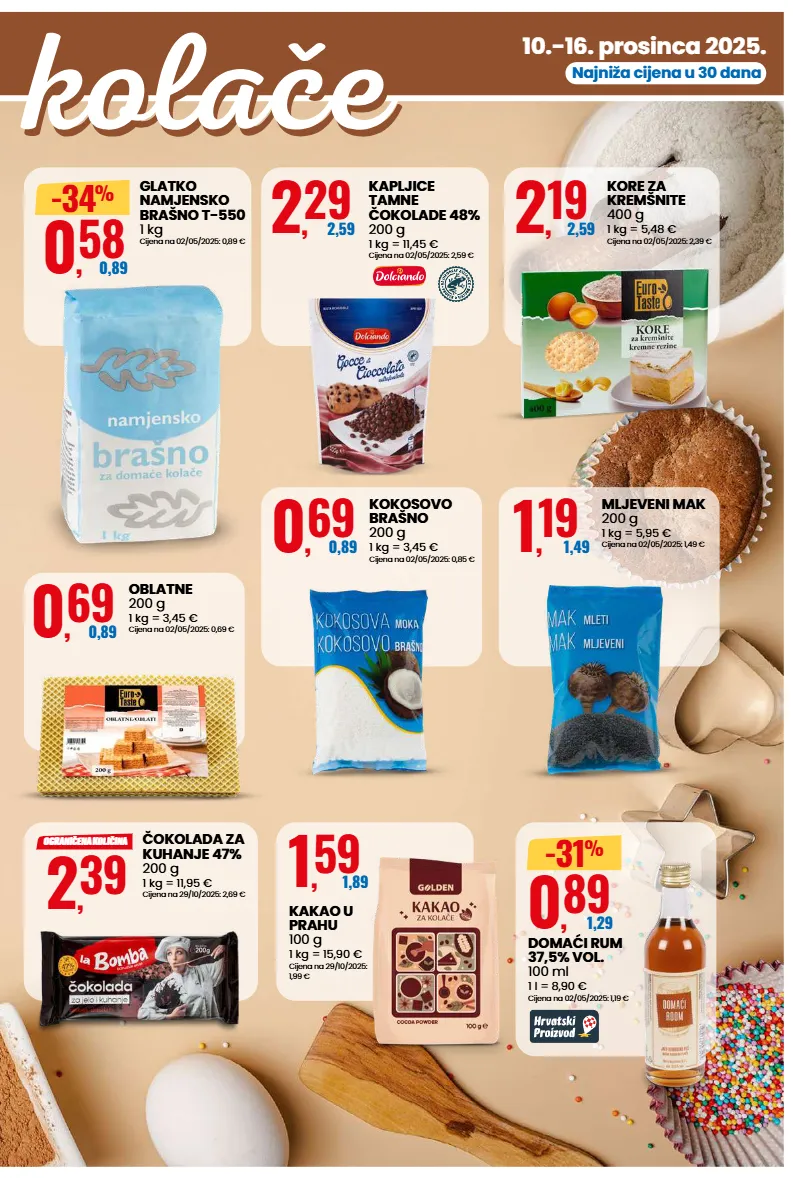 10.-16. prosinca 2025. najniža cijena u 30 dana 0 , 58 0,89 -34 % glatko namjensko brašno t-550 1 kg cijena na 02/05/2025: 0,89 € 2 , 29 2,59 kapljice tamne čokolade 48% 200 g 1 kg = 11,45 € cijena na 02/05/2025: 2,59 € 2 , 19 2,59 kore za kremšnite 400 g 1 kg = 5,48 € cijena na 02/05/2025: 2,39 € 0 , 69 0,89 oblatne 200 g 1 kg = 3,45 € cijena na 02/05/2025: 0,69 € 0 , 69 0,89 kokosovo brašno 200 g 1 kg = 3,45 € cijena na 02/05/2025: 0,85 € 1 , 19 1,49 mljeveni mak 200 g 1 kg = 5,95 € cijena na 02/05/2025: 1,49 € 2 , 39 ograničena količina čokolada za kuhanje 47% 200 g 1 kg = 11,95 € cijena na 29/10/2025: 2,69 € 1 , 59 1,89 kakao u prahu 100 g 1 kg = 15,90 € cijena na 29/10/2025: 1,99 € 0 , 89 1,29 domaći rum 37,5% vol. 100 ml 1 l = 8,90 € cijena na 02/05/2025: 1,19 € -31 %