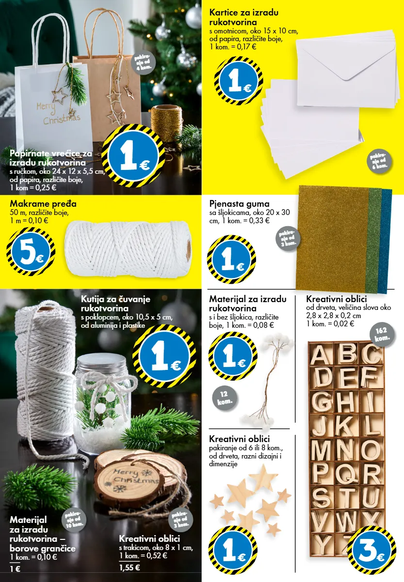 Makrame pređa 50 m, različite boje, 1 m = 0,10 € Kartice za izradu rukotvorina s omotnicom, oko 15 x 10 cm, od papira, različite boje, 1 kom. = 0,17 € Pjenasta guma sa šljokicama, oko 20 x 30 cm, 1 kom. = 0,33 € pakira- nje od 6 kom. pakira- nje od 3 kom. Kreativni oblici pakiranje od 6 ili 8 kom., od drveta, razni dizajni i dimenzije Kreativni oblici od drveta, veličina slova oko 2,8 x 2,8 x 0,2 cm 1 kom. = 0,02 € 162 kom. Materijal za izradu rukotvorina s i bez šljokica, različite boje, 1 kom. = 0,08 € 12 kom. 1 € 1 € Kutija za čuvanje rukotvorina s poklopcem, oko 10,5 x 5 cm, od aluminija i plastike pakira- nje od 3 kom. pakira- nje od 10 kom. Kreativni oblici s trakicom, oko 8 x 1 cm, 1 kom. = 0,52 € 1,55 € Materijal za izradu rukotvorina – borove grančice 1 kom. = 0,10 € 1 € Papirnate vrećice za izradu rukotvorina s ručkom, oko 24 x 12 x 5,5 cm, od papira, različite boje, 1 kom = 0,25 € 1 € 1 € 1 € 3 € 1 € 5 € pakira- nje od 4 kom.