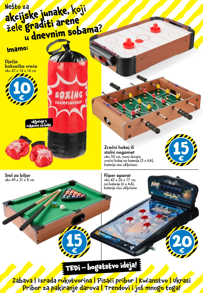 zabava | izrada rukotvorina | pisaći pribor | kućanstvo | ukrasi pribor za pakiranje darova | trendovi i još mnogo toga! tedi – bogatstvo ideja! dječja boksačka vreća oko 42 x 14 x 14 cm zračni hokej ili stolni nogomet oko 50 cm, razni dizajni, zračni hokej na baterije (3 x aa), baterije nisu uključene stol za biljar oko 49 x 31 x 8 cm fliper aparat oko 42 x 26 x 17 cm, na baterije (6 x aa), baterije nisu uključene € 1 5 € 1 5 20 € 10 € uključuje 2 rukavice za boks akcijske junake, koji žele graditi arene u dnevnim sobama ? nešto za imamo: