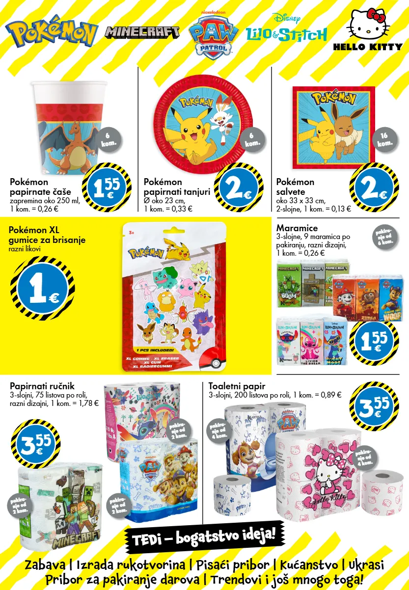 zabava | izrada rukotvorina | pisaći pribor | kućanstvo | ukrasi pribor za pakiranje darova | trendovi i još mnogo toga! tedi – bogatstvo ideja! pakira- nje od 6 kom. maramice 3-slojne, 9 maramica po pakiranju, razni dizajni, 1 kom. = 0,26 € pakira- nje od 4 kom. toaletni papir 3-slojni, 200 listova po roli, 1 kom. = 0,89 € pakira- nje od 4 kom. papirnati ručnik 3-slojni, 75 listova po roli, razni dizajni, 1 kom. = 1,78 € pakira- nje od 2 kom. pakira- nje od 2 kom. pakira- nje od 2 kom. pokémon xl gumice za brisanje razni likovi 2 € 6 kom. pokémon papirnati tanjuri ø oko 23 cm, 1 kom. = 0,33 € pokémon salvete oko 33 x 33 cm, 2-slojne, 1 kom. = 0,13 € 2 € 16 kom. 3 55 € 3 55 € 1 55 € 1 € pokémon papirnate čaše zapremina oko 250 ml, 1 kom. = 0,26 € 6 kom. 1 55 €