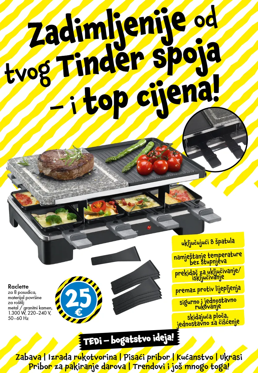zabava | izrada rukotvorina | pisaći pribor | kućanstvo | ukrasi pribor za pakiranje darova | trendovi i još mnogo toga! tedi – bogatstvo ideja! raclette za 8 posudica, materijal površine za roštilj: metal / granitni kamen, 1.300 w, 220–240 v, 50–60 hz € 2 5 zadimljenije od – i top cijena! tvog tinder spoja sigurno i jednostavno rukovanje skidajuća ploča, jednostavno za čišćenje namještanje temperature bez stupnjeva uključujući 8 špatula prekidač za uključivanje/ isključivanje premaz protiv lijepljenja