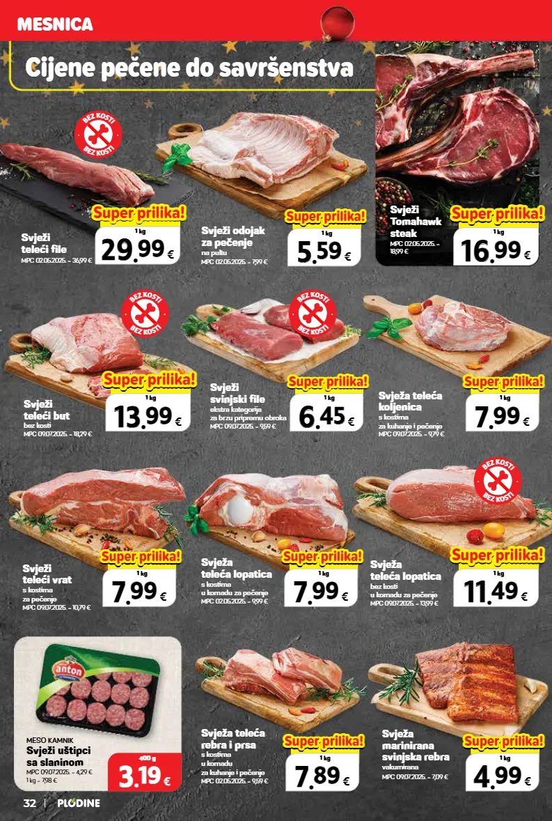 svježa teleća koljenica s kostima za kuhanje i pečenje mpc 09.07.2025. = 9,79 € svježi teleći vrat s kostima za pečenje mpc 09.07.2025. = 10,79 € svježi teleći but bez kosti mpc 09.07.2025. = 18,29 € svježi teleći file mpc 02.05.2025. = 36,99 € svježa teleća rebra i prsa s kostima u komadu za kuhanje i pečenje mpc 02.05.2025. = 9,59 € svježa teleća lopatica s kostima u komadu za pečenje mpc 02.05.2025. = 9,99 € svježi svinjski file ekstra kategorija za brzu pripremu obroka mpc 09.07.2025. = 9,59 € svježa teleća lopatica bez kosti u komadu za pečenje mpc 09.07.2025. = 13,99 € svježa marinirana svinjska rebra vakumirana mpc 09.07.2025. = 7,09 € meso kamnik svježi uštipci sa slaninom mpc 09.07.2025. = 4,29 € 1 kg = 7,98 € svježi tomahawk steak mpc 02.05.2025. = 18,99 € 0.00 € 3 3 . . 19 19 € 400 g cijene pečene do savršenstva mesnica b e z k o s t i b e z k o s t i b e z k o s t i b e z k o s t i b e z k o s t i b e z k o s t i b e z k o s t i b e z k o s t i 32 top cijena! već od hit cijena! 5 5 . . 59 59 € 1 kg super prilika! super prilika! top cijena! već od hit cijena! 16 16 . . 99 99 € 1 kg super prilika! super prilika! top cijena! već od hit cijena! 29 29 . . 99 99 € 1 kg super prilika! super prilika! top cijena! već od hit cijena! 13 13 . . 99 99 € 1 kg super prilika! super prilika! svježi odojak za pečenje na pultu mpc 02.05.2025. = 7,99 € top cijena! već od hit cijena! 11 11 . . 49 49 € 1 kg super prilika! super prilika! top cijena! već od hit cijena! 6 6 . . 45 45 € 1 kg super prilika! super prilika! top cijena! već od hit cijena! 7 7 . . 99 99 € 1 kg super prilika! super prilika! top cijena! već od hit cijena! 7 7 . . 99 99 € 1 kg super prilika! super prilika! top cijena! već od hit cijena! 7 7 . . 89 89 € 1 kg super prilika! super prilika! top cijena! već od hit cijena! 4 4 . . 99 99 € 1 kg super prilika! super prilika! top cijena! već od hit cijena! 7 7 . . 99 99 € 1 kg super prilika! super prilika!