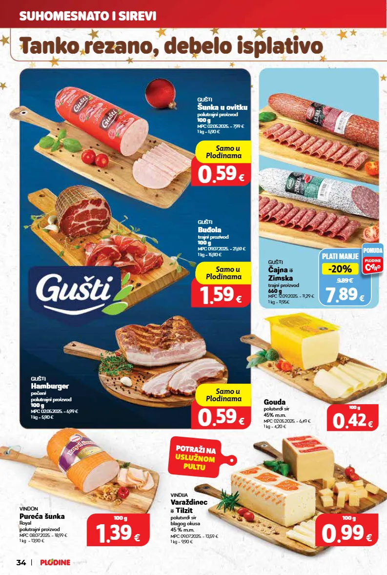 gavrilović prosciutto cotto polutrajni proizvod mpc 22.11.2025. = 15,09 € 1 kg = 9,90 € 0 0 . . 99 99 € 100 g gušti panceta trajni proizvod mpc 02.05.2025. = 11,49 € 1 kg = 10,90 € gavrilović blagdanska šunka mpc 04.12.2025. = 15,99 € 1 kg = 11,80 € madeo plata ventricina ili capocollo dolce trajni proizvod 90 - 100 g mpc 05.12.2025. = 4,99 € 1 kg = 39,90 - 44,33 € gušti suha svinjska pečenica trajni proizvod mpc 09.07.2025. = 20,99 € 1 kg = 15,90 € 1 1 . . 59 59 € 100 g 1 1 . . 09 09 € 100 g 1 1 . . 18 18 € 100 g top cijena! već od hit cijena! super prilika! 3 3 . . 99 99 € 90 - 100 g samo u plodinama -20% -20% 4.99 € mijukić pršut narezak trajni proizvod 500 g mpc 09.12.2025. = 11,99 € 1 kg = 15,78 € plati manje 11.99 € -34% -34% ponuda 7 7 . . 89 89 € gavrilović pašteta guščja s konjakom i tartufima, pačja s konjakom ili teleća sa zelenim paprom mpc 04.11.2025. = 4,20 € 1 kg = 27,90 € 2 2 . . 79 79 € 100 g 2 2 . . 09 09 € 100 g pisinium pršut ruža trajni proizvod mpc 19.05.2025. = 32,99 € 1 kg = 20,90 € plati manje 6.49 € -15% -15% 5 5 . . 49 49 € ponuda pik vrbovec blagdansko pečenje od karea 1 kg mpc 02.05.2025. = 7,99 € 5
