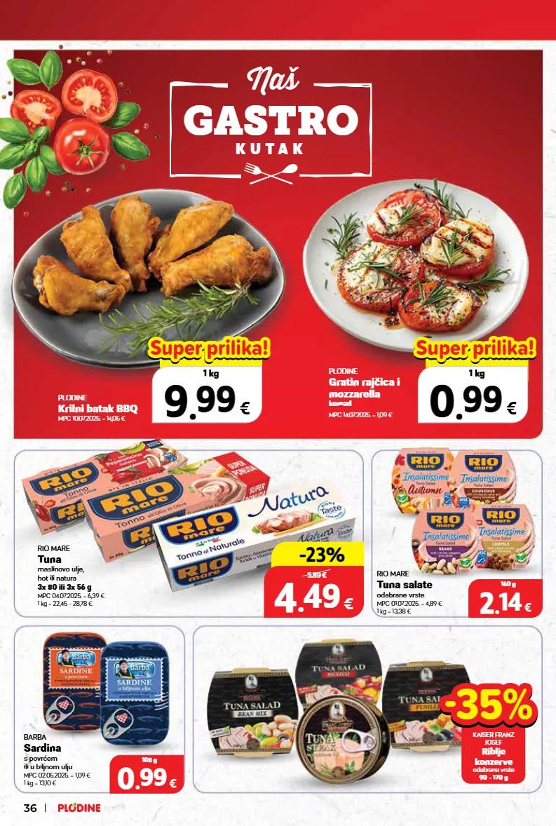 plodine gratin rajčica i mozzarella komad mpc 14.07.2025. = 1,09 € plodine krilni batak bbq mpc 10.07.2025. = 14,05 € rio mare tuna salate odabrane vrste mpc 01.07.2025. = 4,89 € 1 kg = 13,38 € 2 2 . . 14 14 € 160 g rio mare tuna maslinovo ulje, hot ili natura 3x 80 ili 3x 56 g mpc 04.07.2025. = 6,39 € 1 kg = 22,45 - 28,78 € top cijena! već od hit cijena! super pri- lika! 4 4 . . 49 49 € 3x 80 ili 3x 56 g samo u plodinama -23% -23% 5.89 € -35% -35% kaiser franz josef riblje konzerve odabrane vrste 90 - 170 g 0 0 . . 99 99 € 108 g barba sardina s povrćem ili u biljnom ulju mpc 02.05.2025. = 1,09 € 1 kg = 13,10 € top cijena! već od hit cijena! 9 9 . . 99 99 € 1 kg super prilika! super prilika! top cijena! već od hit cijena! 0 0 . . 99 99 € 1 kg super prilika! super prilika! k u t a k naš gastro 36