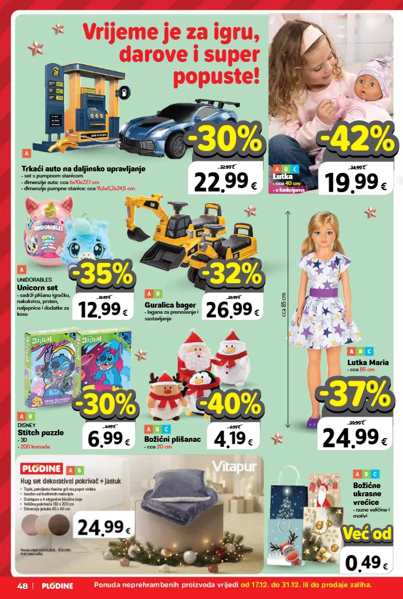 unidorables unicorn set • sadrži plišanu igračku, nakukvicu, prsten, naljepnice i dodatke za kosu trkaći auto na daljinsko upravljanje • set s pumpnom stanicom • dimenzije auta: cca 6x10x22.1 cm • dimenzije pumpne stanice: cca 16,6x5,2x24,5 cm božićni plišanac • cca 20 cm guralica bager • lagana za prenošenje i sastavljanje božićne ukrasne vrećice • razne veličine i motivi disney stitch puzzle • 3d • 200 komada a b c lutka maria • cca 85 cm top cijena! već od hit cijena! super prilika! 4 4 . . 19 19 € samo u plodinama 6.99 € lutka • cca 40 cm • s funkcijama top cijena! već od hit cijena! super prilika! 6 6 . . 99 99 € samo u plodinama 9.99 € top cijena! već od hit cijena! super prilika! 26 26 . . 99 99 € samo u plodinama 39.99 € top cijena! već od hit cijena! super prilika! 12 12 . . 99 99 € samo u plodinama 19.99 € top cijena! već od hit cijena! super prilika! 24 24 . . 99 99 € samo u plodinama 39.99 € -37% -37% top cijena! već od hit cijena! super prilika! 19 19 . . 99 99 € samo u plodinama 34.99 € -42% -42% top cijena! već od hit cijena! super prilika! 22 22 . . 99 99 € samo u plodinama 32.99 € -30% -30% -30% -30% -32% -32% -35% -35% -40% -40% top cijena! 0 0 . . 49 49 € već od već od vrijeme je za igru, darove i super popuste! 48