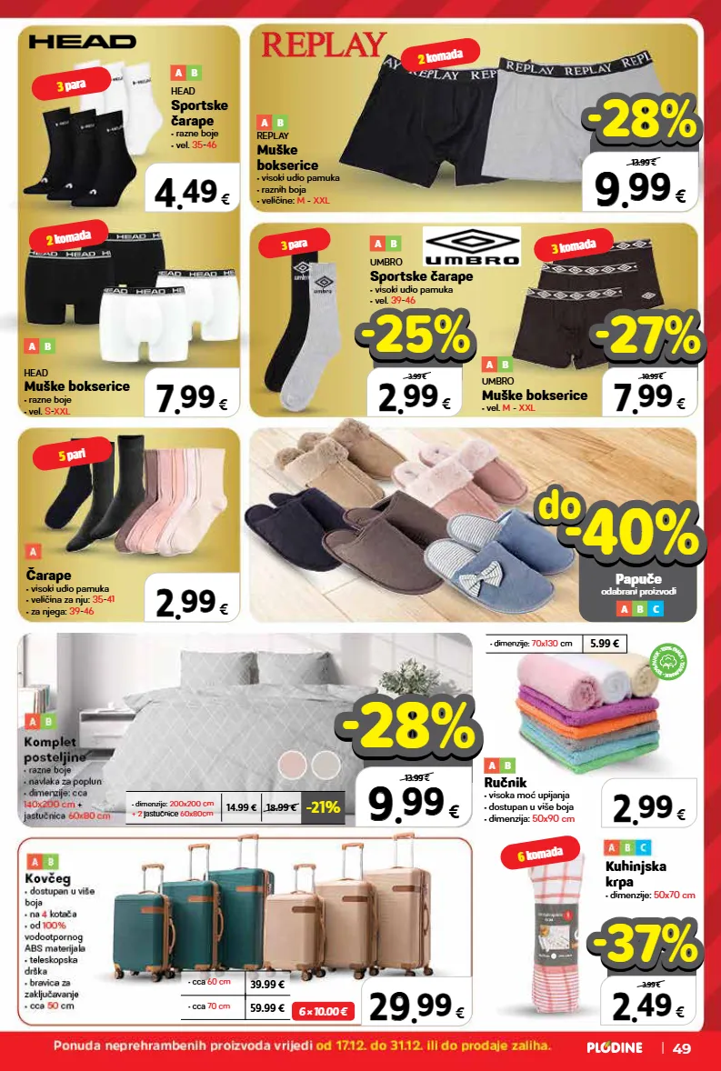a b ručnik • visoka moć upijanja • dostupan u više boja • dimenzija: 50x90 cm • 1 0 0 % p a m u k • 1 0 0 % p a m u k • 1 0 0 % p a m u k 29 29 . . 99 99 € čarape • visoki udio pamuka • veličina za nju: 35-41 • za njega: 39-46 a b head sportske čarape • razne boje • vel. 35-46 a b head muške bokserice • razne boje • vel. s-xxl a b umbro sportske čarape • visoki udio pamuka • vel. 39-46 4 4 . . 49 49 € top cijena! već od hit cijena! super prilika! 7 7 . . 99 99 € samo u plodinama 10.99 € -27% -27% top cijena! već od hit cijena! super prilika! 2 2 . . 99 99 € samo u plodinama 3.99 € -25% -25% 2 2 . . 99 99 € 7 7 . . 99 99 € a b replay muške bokserice • visoki udio pamuka • raznih boja • veličine: m - xxl a b umbro muške bokserice • vel. m - xxl top cijena! već od hit cijena! super prilika! 9 9 . . 99 99 € samo u plodinama 13.99 € -28% -28% 2 2 . . 99 99 € kuhinjska krpa • dimenzije: 50x70 cm papuče odabrani proizvodi -40% -40% do do a b c top cijena! već od hit cijena! super prilika! 2 2 . . 49 49 € samo u plodinama 3.99 € -37% -37% top cijena! već od hit cijena! super prilika! 9 9 . . 99 99 € samo u plodinama 13.99 € -28% -28% 3 komada 3 para 5 pari 3 para 2 komada 2 komada 6 komada 49 • dimenzije: 200x200 cm + 2 jastučnice 60x80cm -21% 14.99 € 18.99 € • cca 60 cm 39.99 € • cca 70 cm 59.99 € 6 × 10.00 € • dimenzije: 70x130 cm 5.99 €