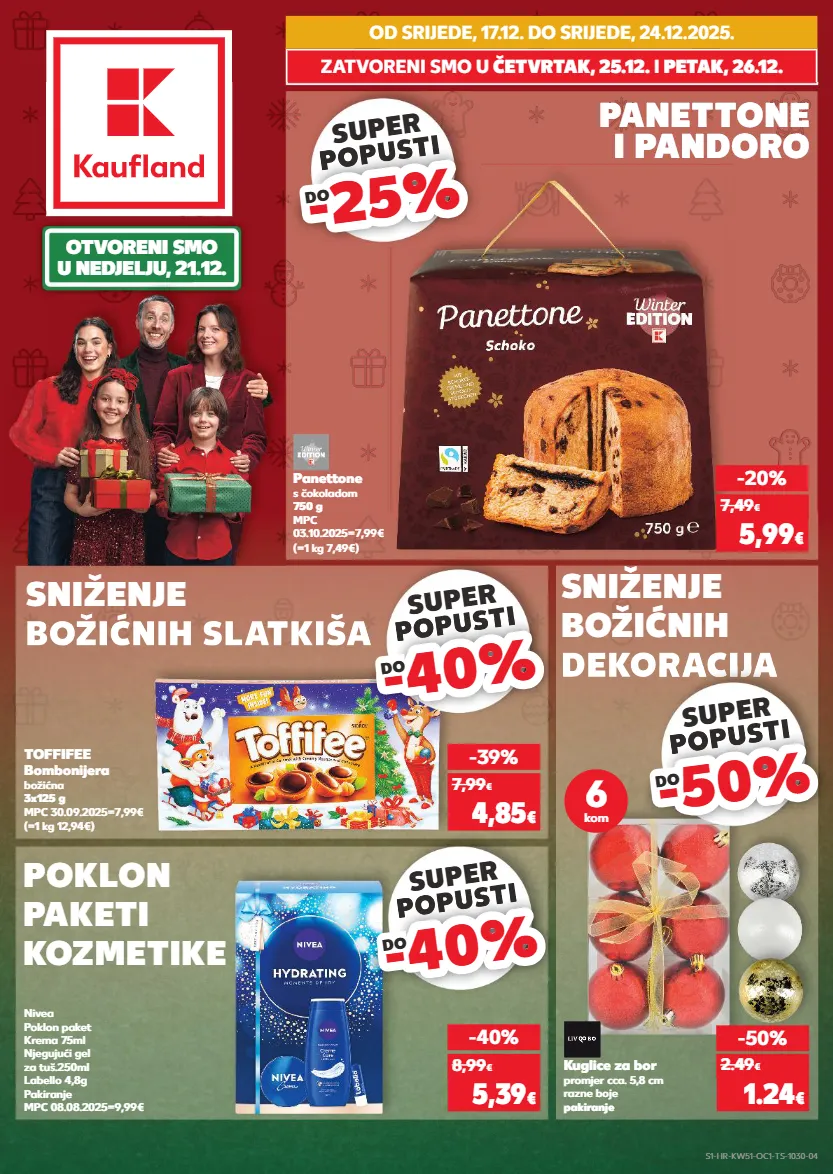 KRATKOTRAJNA PONUDA samo SUPER CIJENA KRATKOTRAJNA PONUDA samo SUPER CIJENA KRATKOTRAJNA PONUDA samo SUPER CIJENA KRATKOTRAJNA PONUDA samo SUPER CIJENA OTVORENI SMO U NEDJELJU, 21.12. SNIŽENJE BOŽIĆNIH DEKORACIJA SNIŽENJE BOŽIĆNIH SLATKIŠA PANETTONE I PANDORO POKLON PAKETI KOZMETIKE OD SRIJEDE, 17.12. DO SRIJEDE, 24.12.2025. ZATVORENI SMO U ČETVRTAK, 25.12. I PETAK, 26.12. Panettone s čokoladom 750 g MPC 03.10.2025=7,99€ (=1 kg 7,49€) -20% 5,99 € 7,49 € TOFFIFEE Bombonijera božićna 3x125 g MPC 30.09.2025=7,99€ (=1 kg 12,94€) 4,85 € 7,99 € -39% Nivea Poklon paket Krema 75ml Njegujući gel za tuš.250ml Labello 4,8g Pakiranje MPC 08.08.2025=9,99€ -40% 5,39 € 8,99 € Kuglice za bor promjer cca. 5,8 cm razne boje pakiranje -50% 1.24 € 2.49 € 6 kom DEKORACIJA SUPER POPUSTI POPUSTI -50% -50% DO SUPER POPUSTI POPUSTI -2 5% -25% DO SUPER POPUSTI BOŽIĆNIH SLATKIŠA BOŽIĆNIH SLATKIŠA POPUSTI -40% -40% DO SUPER POPUSTI POPUSTI -40% -40% DO S1-HR-KW51-OC1-TS-1030-04