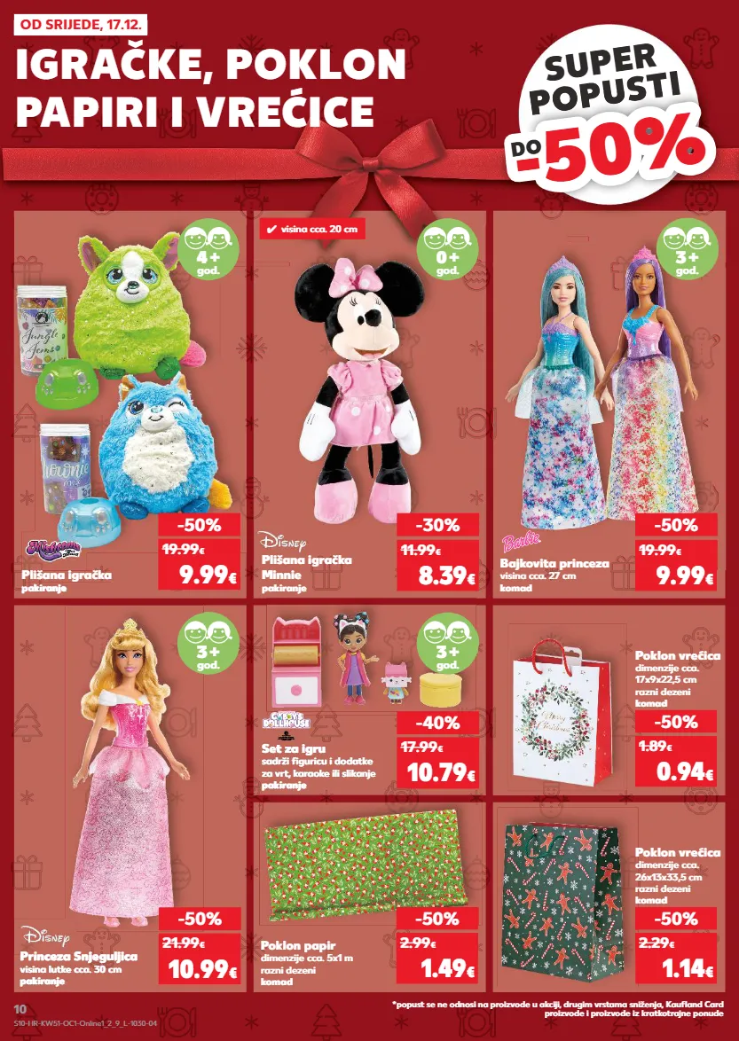 KRATKOTRAJNA PONUDA KRATKOTRAJNA PONUDA KRATKOTRAJNA PONUDA SUPER CIJENA SUPER CIJENA SUPER CIJENA KRATKOTRAJNA PONUDA KRATKOTRAJNA PONUDA SUPER CIJENA SUPER CIJENA KRATKOTRAJNA PONUDA KRATKOTRAJNA PONUDA KRATKOTRAJNA PONUDA samo samo samo SUPER CIJENA SUPER CIJENA SUPER CIJENA OD SRIJEDE, 17.12. IGRAČKE, POKLON PAPIRI I VREĆICE Plišana igračka pakiranje Plišana igračka Minnie pakiranje Bajkovita princeza visina cca. 27 cm komad -50% -30% -50% 9.99 € 8.39 € 9.99 € 19.99 € 11.99 € 19.99 € Princeza Snjeguljica visina lutke cca. 30 cm pakiranje Set za igru sadrži figuricu i dodatke za vrt, karaoke ili slikanje pakiranje -50% -40% 10.99 € 10.79 € 21.99 € 17.99 € Poklon vrećica dimenzije cca. 26x13x33,5 cm razni dezeni komad Poklon papir dimenzije cca. 5x1 m razni dezeni komad Poklon vrećica dimenzije cca. 17x9x22,5 cm razni dezeni komad -50% -50% -50% 1.14 € 1.49 € 0.94 € 2.29 € 2.99 € 1.89 € 4 + god. 3 + god. 3 + god. 0 + god. 3 + god. *popust se ne odnosi na proizvode u akciji, drugim vrstama sniženja, Kaufland Card proizvode i proizvode iz kratkotrajne ponude SUPER POPUSTI POPUSTI -50% -50% DO ✓ visina cca. 20 cm S10-HR-KW51-OC1-Online1_2_9_L-1030-04 10