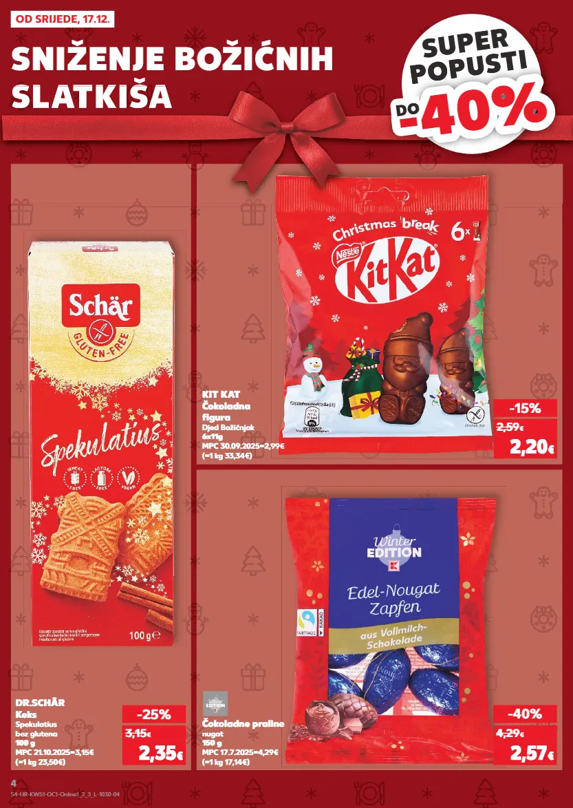 kratkotrajna ponuda -0% samo kratkotrajna ponuda samo super cijena kratkotrajna ponuda samo super cijena od srijede, 17.12. sniženje božićnih slatkiša dr.schär keks spekulatius bez glutena 100 g mpc 21.10.2025=3,15€ (=1 kg 23,50€) 2,35 € 3,15 € čokoladne praline nugat 150 g mpc 17.7.2025=4,29€ (=1 kg 17,14€) -40% 2,57 € kit kat čokoladna figura djed božićnjak 6x11g mpc 30.09.2025=2,99€ (=1 kg 33,34€) -15% 2,20 € -25% 4,29 € 2,59 € slatkiša slatkiša slatkiša slatkiša slatkiša slatkiša slatkiša slatkiša slatkiša super popusti popusti -40% -40% do s4-hr-kw51-oc1-online1_2_3_l-1030-04 4