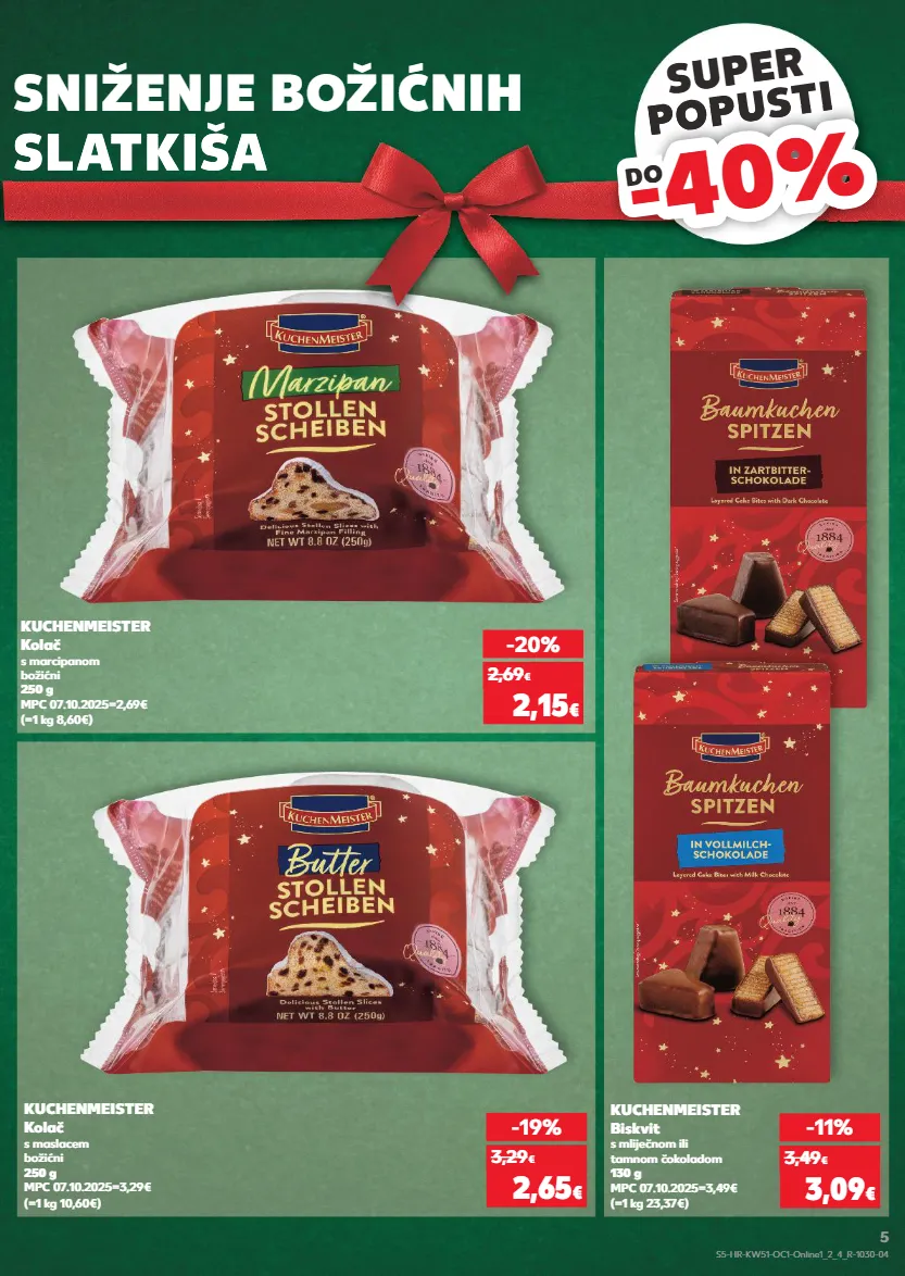 KRATKOTRAJNA PONUDA samo SUPER CIJENA KRATKOTRAJNA PONUDA samo SUPER CIJENA KRATKOTRAJNA PONUDA samo SUPER CIJENA -00 % * DO SNIŽENJE BOŽIĆNIH SLATKIŠA KUCHENMEISTER Biskvit s mliječnom ili tamnom čokoladom 130 g MPC 07.10.2025=3,49€ (=1 kg 23,37€) KUCHENMEISTER Kolač s maslacem božićni 250 g MPC 07.10.2025=3,29€ (=1 kg 10,60€) 3,09 € 2,65 € 3,49 € 3,29 € -19% KUCHENMEISTER Kolač s marcipanom božićni 250 g MPC 07.10.2025=2,69€ (=1 kg 8,60€) 2,15 € 2,69 € -20% -11% SLATKIŠA SLATKIŠA SLATKIŠA SUPER POPUSTI POPUSTI -40% -40% DO S5-HR-KW51-OC1-Online1_2_4_R-1030-04 5