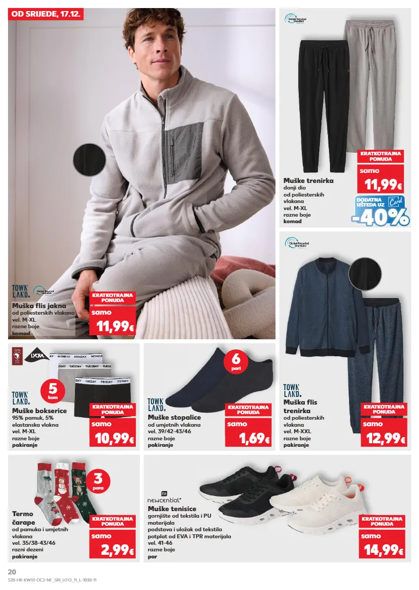 od srijede, 17.12. kratkotrajna ponuda samo 11,99 € muška flis trenirka od poliesterskih vlakana vel. m-xxl razne boje pakiranje kratkotrajna ponuda samo 12,99 € termo čarape od pamuka i umjetnih vlakana vel. 35/38-43/46 razni dezeni pakiranje muške tenisice gornjište od tekstila i pu materijala podstava i uložak od tekstila potplat od eva i tpr materijala vel. 41-46 razne boje par kratkotrajna ponuda kratkotrajna ponuda samo samo 2,99 € 14,99 € muške bokserice 95% pamuk, 5% elastanska vlakna vel. m-xl razne boje pakiranje kratkotrajna ponuda samo 10,99 € muške stopalice od umjetnih vlakana vel. 39/42-43/46 razne boje pakiranje kratkotrajna ponuda samo 1,69 € 3 para 6 pari 5 kom muška flis jakna od poliesterskih vlakana vel. m-xl razne boje komad dodatna ušteda uz muške trenirka donji dio od poliesterskih vlakana vel. m-xl razne boje komad kratkotrajna ponuda samo 11,99 € sa o 11,99 samo 11,99 samo 11,99 samo 11,99 samo samo € - - 40% 40% s20-hr-kw51-oc2-nf_sri_uto_11_l-1030-11 20