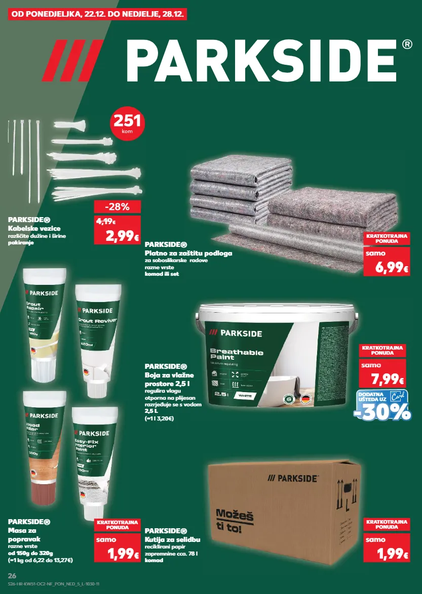 KRATKOTRAJNA PONUDA OD PONEDJELJKA, 22.12. DO NEDJELJE, 28.12. PARKSIDE® Platno za zaštitu podloga za soboslikarske radove razne vrste komad ili set KRATKOTRAJNA PONUDA samo 6,99 € PARKSIDE® Masa za popravak razne vrste od 150g do 320g PARKSIDE® Kutija za selidbu reciklirani papir zapremnine cca. 78 l komad PARKSIDE® Kabelske vezice različite dužine i širine pakiranje KRATKOTRAJNA PONUDA KRATKOTRAJNA PONUDA samo samo samo -28% 1,99 € 1,99 € 2,99 € 4,19 € 251 kom DODATNA UŠTEDA UZ (=1 l 3,20€) (=1 kg od 6,22 do 13,27€) PARKSIDE® Boja za vlažne prostore 2,5 l regulira vlagu otporna na plijesan razrjeđuje se s vodom 2,5 L KRATKOTRAJNA PONUDA samo 7,99 € sa o 7,99 samo 7,99 samo 7,99 samo 7,99 samo samo € o € o - - 30% 30% - 28% 251 kom S26-HR-KW51-OC2-NF_PON_NED_5_L-1030-11 26