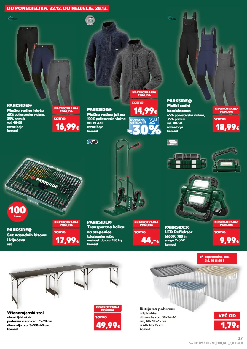 od ponedjeljka, 22.12. do nedjelje, 28.12. parkside® muške radne hlače 65% poliesterska vlakna, 35% pamuk vel. 48-58 razne boje komad parkside® muški radni kombinezon 65% poliesterska vlakna, 35% pamuk vel. 48-58 razne boje komad kratkotrajna ponuda kratkotrajna ponuda samo samo kratkotrajna ponuda super cijena kratkotrajna super cijena kratkotrajna ponuda super cijena onuda 16,99 € 18,99 € parkside@ set nasadnih bitova i ključeva set kratkotrajna ponuda samo 17,99 € višenamjenski stol aluminijski okvir podesiva visina cca. 75-90 cm dimenzije cca. 3x100x60 cm komad kratkotrajna ponuda samo 49,99 € kutija za pohranu od plastike dimenzije cca. 30x26x16 cm, 40x30x23 cm ili 60x40x35 cm komad parkside® transportna kolica za stepenice teleskopska ručka nosivost do cca. 150 kg komad kratkotrajna ponuda samo 44,- € parkside® led reflektor 6500 k, 700 lm snaga 2x5 w komad kratkotrajna ponuda samo 9,99 € 100 kom dodatna ušteda uz parkside® muška radna jakna 100% poliesterska vlakna vel. m-xxl razne boje komad kratkotrajna ponuda samo 14,99 € sa 14,99 samo 14,99 samo 14,99 samo 14,99 samo samo € - - 30% 30% ✓ zapremnine cca. 5,5, 18 ili 58 l već od 1,79 € s27-hr-kw51-oc2-nf_pon_ned_6_r-1030-11 27