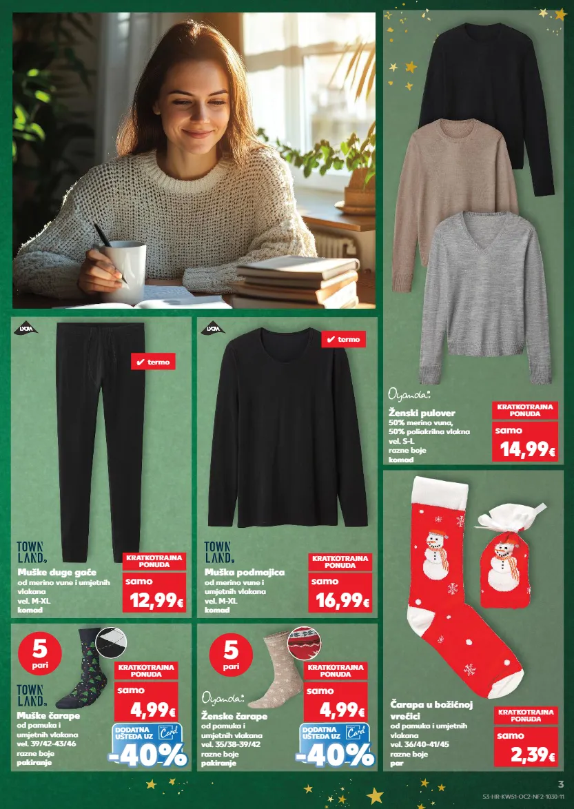 čarapa u božićnoj vrećici od pamuka i umjetnih vlakana vel. 36/40-41/45 razne boje par kratkotrajna ponuda samo kratkotrajna ponuda super cijena kratkotrajna super cijena kratkotrajna ponuda super cijena onuda 2,39 € muške čarape od pamuka i umjetnih vlakana vel. 39/42-43/46 razne boje pakiranje ženski pulover 50% merino vuna, 50% poliakrilna vlakna vel. s-l razne boje komad kratkotrajna ponuda samo 14,99 € kratkotrajna ponuda samo 4,99 € dodatna ušteda uz - - 40% 40% muška podmajica od merino vune i umjetnih vlakana vel. m-xl komad kratkotrajna ponuda samo 16,99 € ✓ termo muške duge gaće od merino vune i umjetnih vlakana vel. m-xl komad kratkotrajna ponuda samo 12,99 € ✓ termo ženske čarape od pamuka i umjetnih vlakana vel. 35/38-39/42 razne boje pakiranje kratkotrajna ponuda samo 4,99 € dodatna ušteda uz - - 40% 40% 5 pari 5 pari s3-hr-kw51-oc2-nf2-1030-11 3