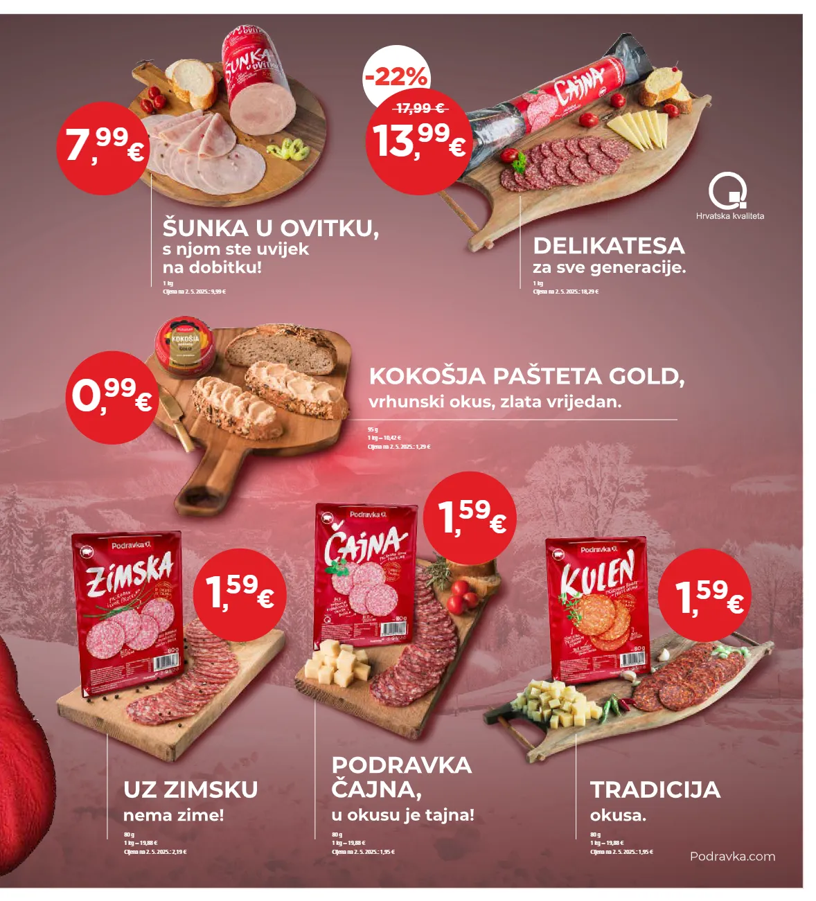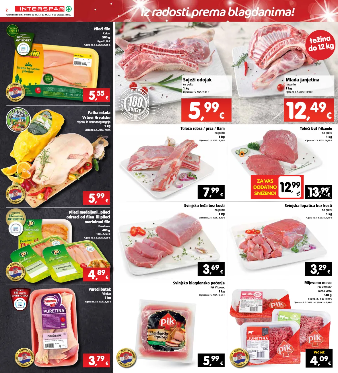svinjska lopatica bez kosti na pultu 1 kg cijena na 2. 5. 2025.: 5,19 € teleći but frikando na pultu 1 kg cijena na 2. 5. 2025.: 16,99 € 3 , 79 € mljeveno meso pik vrbovec razne vrste 540 g 1 kg od 7,57 € do 11,09 € cijena na 2. 5. 2025.: od 3,99 € do 6,99 € 4 , 89 € pileći medaljoni , pileći odresci od filea ili pileći marinirani file perutnina 400 g 1 kg = 12,23 € cijena na 2. 5. 2025.: 5,99 € 5 , 55 € pileći file cekin 500 g 1 kg = 11,10 € cijena na 2. 5. 2025.: 6,35 € pureći batak vindon 1 kg cijena na 2. 5. 2025.: 5,69 € patka mlada vrtovi hrvatske svježa, iz slobodnog uzgoja 1 kg cijena na 2. 5. 2025.: 7,69 € 5 , 99 € svinjsko blagdansko pečenje pik vrbovec 1 kg cijena na 2. 5. 2025.: 7,69 € 5 , 99 € 3 , 29 € 13 , 99 € svinjska leđa bez kosti na pultu 1 kg cijena na 2. 5. 2025.: 6,99 € teleća rebra / prsa / flam na pultu 1 kg cijena na 2. 5. 2025.: 9,59 € 3 , 69 € 7 , 99 € mlada janjetina na pultu 1 kg cijena na 2. 5. 2025.: 13,99 € 12 , 49 € svježi odojak na pultu 1 kg cijena na 2. 5. 2025.: 5,99 € 5 , 99 € h r v a t s k a k v a l i t e t a h r v a t s k a k v a l i t e t a h r v a t s k a k v a l i t e t a h r v a t s k a k v a l i t e t a h r v a t s k a k v a l i t e t a h r v a t s k a k v a l i t e t a h r v a t s k a k v a l i t e t a h r v a t s k a k v a l i t e t a h r v a t s k a k v a l i t e t a h r v a t s k a k v a l i t e t a h r v a t s k a k v a l i t e t a h r v a t s k a k v a l i t e t a 4 , 09 € već od: težina do 12 kg 12 , 99 iz radosti prema blagdanima! iz radosti prema blagdanima! ponuda na stranici 2 vrijedi od 17. 12. do 24. 12. ili do prodaje zaliha. 2