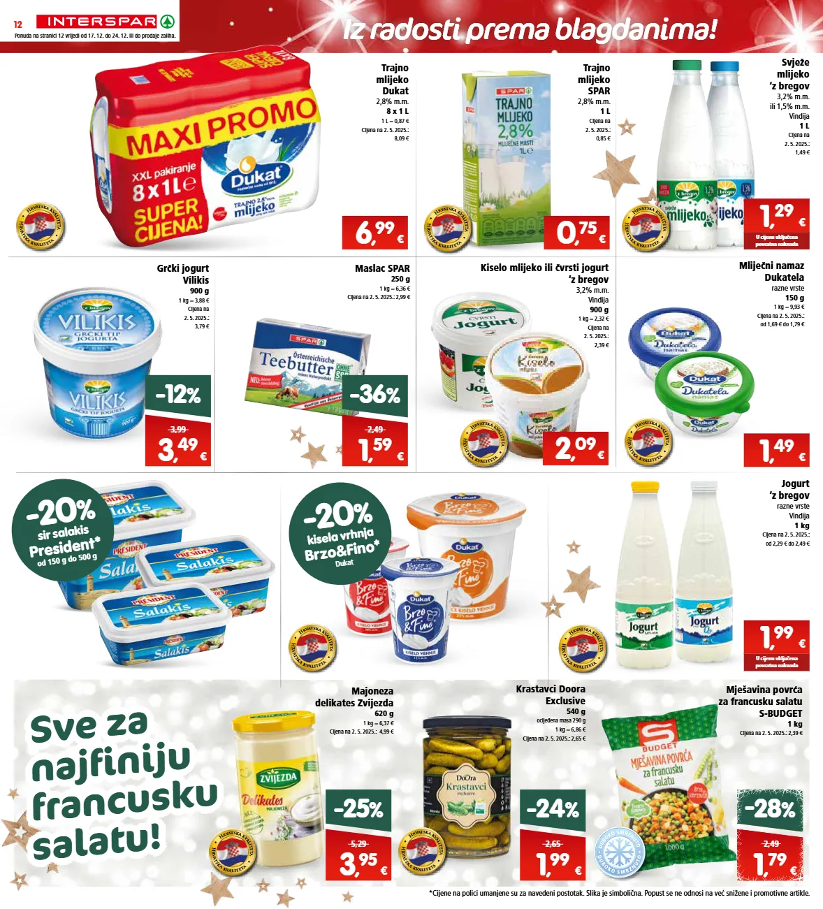 sve za sve za najfiniju najfiniju francusku francusku salatu! salatu! -20 % kisela vrhnja brzo&fino* dukat -20 % sir salakis president* od 150 g do 500 g trajno mlijeko spar 2,8% m.m. 1 l cijena na 2. 5. 2025.: 0,85 € jogurt ‘z bregov razne vrste vindija 1 kg cijena na 2. 5. 2025.: od 2,29 € do 2,49 € mliječni namaz dukatela razne vrste 150 g 1 kg = 9,93 € cijena na 2. 5. 2025.: od 1,69 € do 1,79 € svježe mlijeko ‘z bregov 3,2% m.m. ili 1,5% m.m. vindija 1 l cijena na 2. 5. 2025.: 1,49 € maslac spar 250 g 1 kg = 6,36 € cijena na 2. 5. 2025.: 2,99 € grčki jogurt vilikis 900 g 1 kg = 3,88 € cijena na 2. 5. 2025.: 3,79 € 1 , 79 € 2,49 -28 % 0 , 75 € 6 , 99 € 2 , 09 € 1 , 99 € 1 , 49 € 1 , 99 € 2,65 -24 % 3 , 95 € 5,29 -25 % 3 , 49 € 3,99 -12 % 1 , 59 € 2,49 -36 % h r v a t s k a k v a l i t e t a h r v a t s k a k v a l i t e t a h r v a t s k a k v a l i t e t a h r v a t s k a k v a l i t e t a h r v a t s k a k v a l i t e t a h r v a t s k a k v a l i t e t a h r v a t s k a k v a l i t e t a h r v a t s k a k v a l i t e t a h r v a t s k a k v a l i t e t a h r v a t s k a k v a l i t e t a h r v a t s k a k v a l i t e t a h r v a t s k a k v a l i t e t a h r v a t s k a k v a l i t e t a h r v a t s k a k v a l i t e t a u cijenu uključena povratna naknada 1 , 29 € u cijenu uključena povratna naknada kiselo mlijeko ili čvrsti jogurt ‘z bregov 3,2% m.m. vindija 900 g 1 kg = 2,32 € cijena na 2. 5. 2025.: 2,39 € h r v a t s k a k v a l i t e t a h r v a t s k a k v a l i t e t a majoneza delikates zvijezda 620 g 1 kg = 6,37 € cijena na 2. 5. 2025.: 4,99 € krastavci doora exclusive 540 g ocijeđena masa 290 g 1 kg = 6,86 € cijena na 2. 5. 2025.: 2,65 € mješavina povrća za francusku salatu s-budget 1 kg cijena na 2. 5. 2025.: 2,39 € iz radosti prema blagdanima! ponuda na stranici 12 vrijedi od 17. 12. do 24. 12. ili do prodaje zaliha. 12 *cijene na polici umanjene su za navedeni postotak. slika je simbolična. popust se ne odnosi na već snižene i promotivne artikle. iz radosti prema blagdanima! trajno mlijeko dukat 2,8% m.m. 8 x 1 l 1 l = 0,87 € cijena na 2. 5. 2025.: 8,09 € h r v a t s k a k v a l i t e t a h r v a t s k a k v a l i t e t a