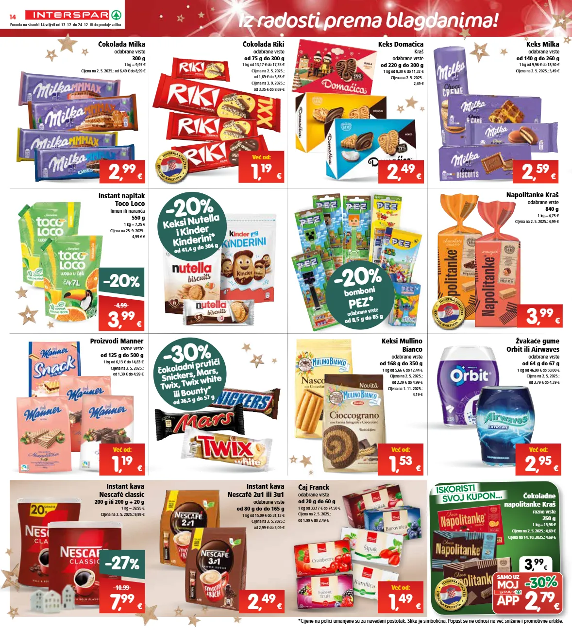3 , 99 € iskoristi svoj kupon... samo uz 2 , 79 € -30% -30% 2 , 95 € već od: 1 , 53 € već od: 1 , 19 € već od: keksi mullino bianco odabrane vrste od 168 g do 350 g 1 kg od 5,66 € do 12,44 € cijena na 2. 5. 2025.: od 2,29 € do 4,99 € cijena na 1. 11. 2025.: 4,19 € -20 % keksi nutella i kinder kinderini* od 41,4 g do 304 g -20 % bomboni pez* odabrane vrste od 8,5 g do 85 g -30 % čokoladni prutići snickers, mars, twix, twix white ili bounty* od 36,5 g do 57 g 3 , 99 € 4,99 -20 % 7 , 99 € 10,99 -27 % napolitanke kraš odabrane vrste 840 g 1 kg = 4,75 € cijena na 2. 5. 2025.: 4,99 € čokoladne napolitanke kraš razne vrste 250 g 1 kg = 15,96 € cijena na 2. 5. 2025.: 4,69 € cijena na 14. 10. 2025.: 4,69 € keks domaćica kraš odabrane vrste od 220 g do 300 g 1 kg od 8,30 € do 11,32 € cijena na 2. 5. 2025.: 2,49 € čokolada riki odabrane vrste od 75 g do 300 g 1 kg od 13,17 € do 17,35 € cijena na 2. 5. 2025.: od 1,69 € do 3,85 € cijena na 3. 9. 2025.: od 3,35 € do 8,69 € proizvodi manner razne vrste od 125 g do 500 g 1 kg od 6,13 € do 14,83 € cijena na 2. 5. 2025.: od 1,39 € do 4,99 € žvakaće gume orbit ili airwaves odabrane vrste od 64 g do 67 g 1 kg od 46,90 € do 50,00 € cijena na 2. 5. 2025.: od 3,79 € do 4,39 € instant kava nescafé classic 200 g ili 200 g + 20 g 1 kg = 39,95 € cijena na 2. 5. 2025.: 9,99 € instant kava nescafé 2u1 ili 3u1 odabrane vrste od 80 g do do 165 g 1 kg od 15,09 € do 31,13 € cijena na 2. 5. 2025.: od 2,99 € do 3,09 € 2 , 49 € čaj franck odabrane vrste od 20 g do 60 g 1 kg od 33,17 € do 74,50 € cijena na 2. 5. 2025.: od 1,99 € do 2,49 € instant napitak toco loco limun ili naranča 550 g 1 kg = 7,25 € cijena na 25. 9. 2025.: 4,99 € € čokolada milka odabrane vrste 300 g 1 kg = 9,97 € cijena na 2. 5. 2025.: od 6,49 € do 8,99 € keks milka odabrane vrste od 140 g do 260 g 1 kg od 9,96 € do 18,50 € cijena na 2. 5. 2025.: 3,49 € h r v a t s k a k v a l i t e t a h r v a t s k a k v a l i t e t a h r v a t s k a k v a l i t e t a h r v a t s k a k v a l i t e t a h r v a t s k a k v a l i t e t a h r v a t s k a k v a l i t e t a 2 , 49 € 3 , 99 € 2 , 99 € 2 , 59 € 1 , 49 € već od: 1 , 19 € već od: 14 *cijene na polici umanjene su z a navedeni postotak. slika j e simbolična. popust se ne odnosi na v eć sniene i promotivne artikle. ponuda na stranici 14 vrijedi od 17. 12. do 24. 12. ili do prodaje zaliha. iz radosti prema blagdanima!